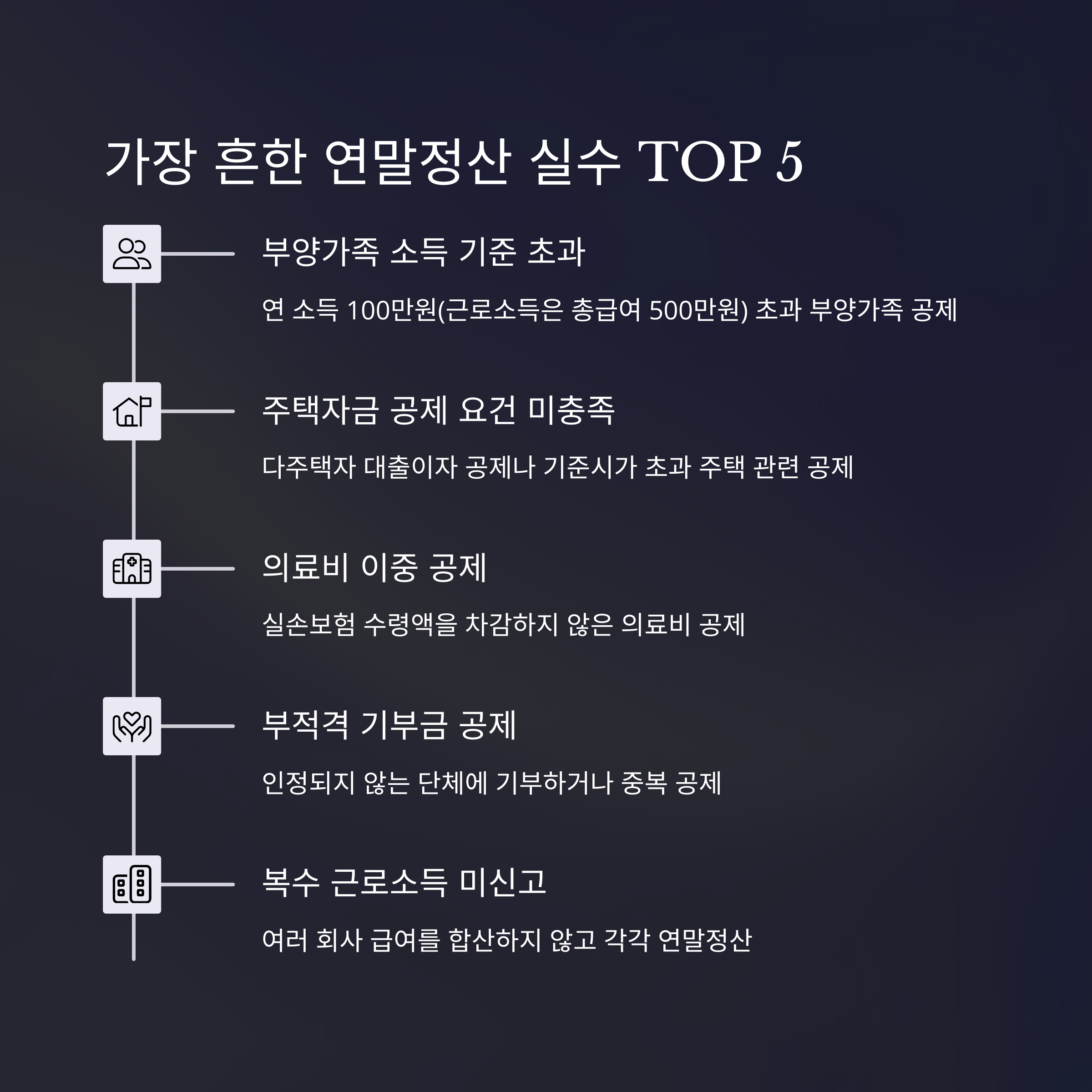 다음 항목들은 연말정산 때 놓치기 쉬운 공제 사항입니다: