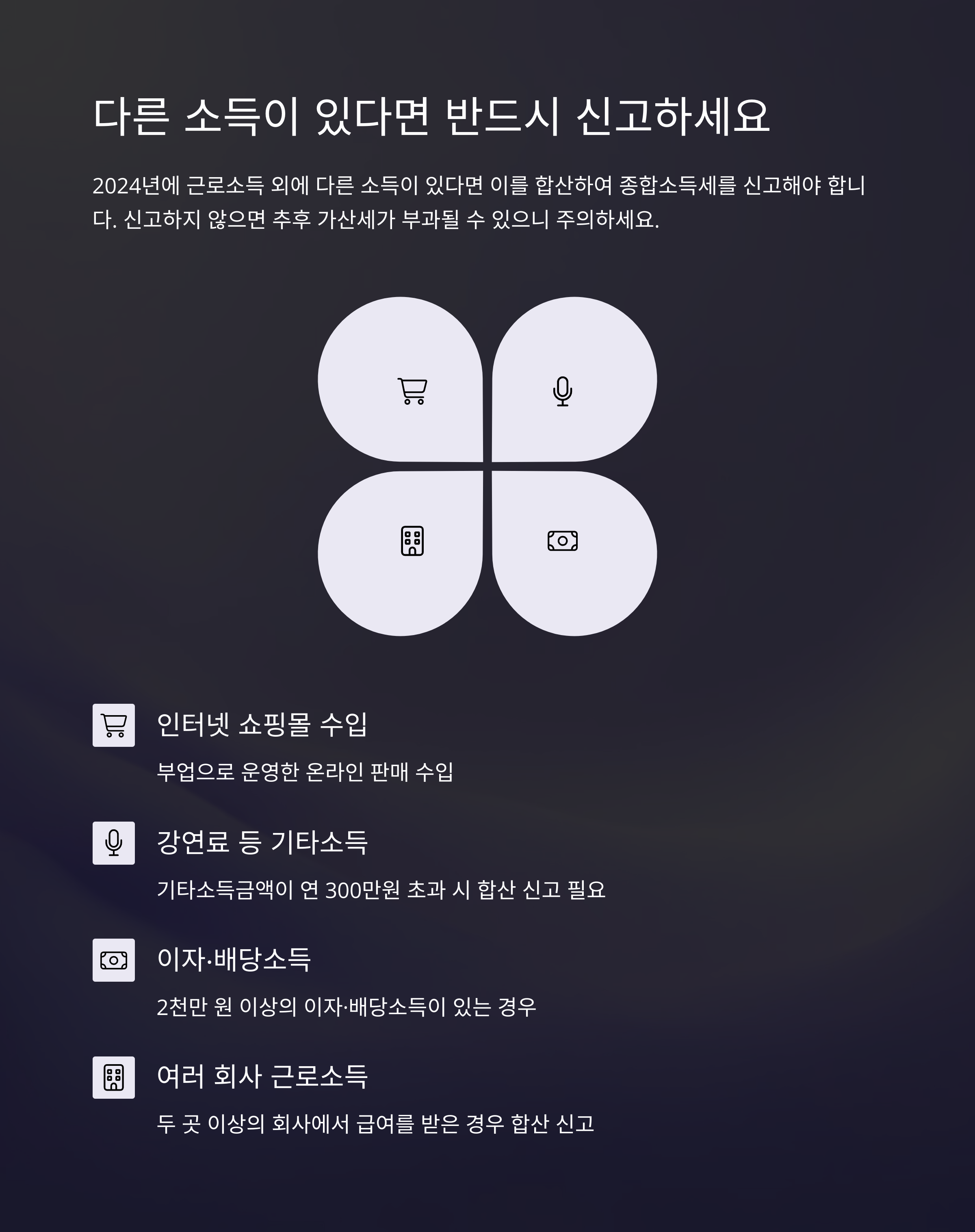 2024년에 근로소득 외에 인터넷 쇼핑몰 운영 수입이나 강연료 등의 기타소득, 또는 2천만 원 이상의 이자·배당소득이 있는 경우, 이를 근로소득과 합산하여 종합소득세를 신고해야 합니다.