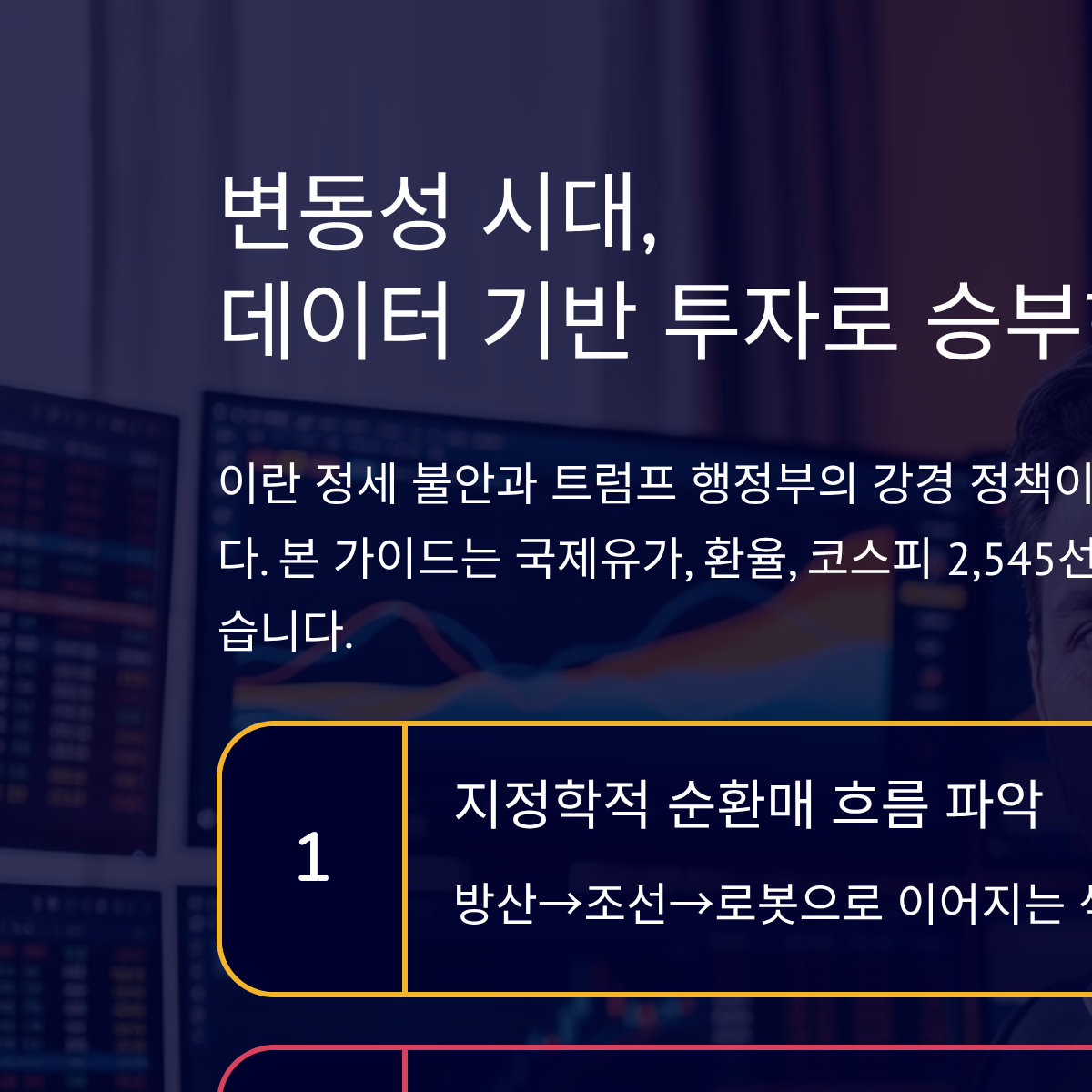 이란의 내부 정세 불안과 트럼프 행정부의 강경한 대외 정책이 맞물리며 시장은 유례없는 변동성을 보이고 있습니다. 본 가이드는 단순한 테마주 나열을 넘어, 국제유가와 환율, 그리고 코스피 2545선이라는 기술적 변곡점까지 입체적으로 분석하여 시장의 본질을 꿰뚫는 데 집중했습니다. 특히 방산에서 조선, 로봇으로 이어지는 지정학적 순환매 흐름을 파악하는 것이 이번 장세의 핵심 차별점입니다.