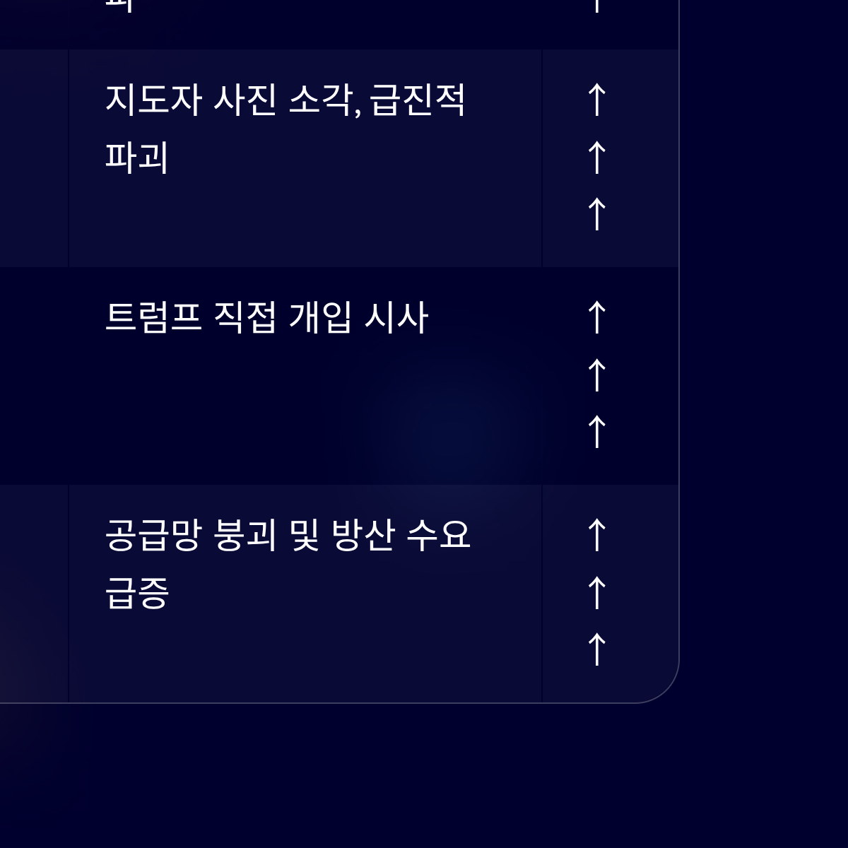 - 표에서 주목할 점: 트럼프 행정부의 개입 시사는 이란 내부 시위에 기름을 붓는 격이며, 이는 중동 정세의 예측 불가능성(Unpredictability)을 역대 최고치로 끌어올리고 있습니다.