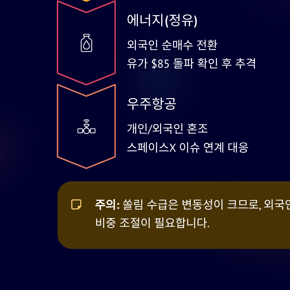 | 우주항공 | 개인/외국인 혼조 | 스페이스X 상장 이슈와 연계 대응 | 정책 모멘텀 활용 |