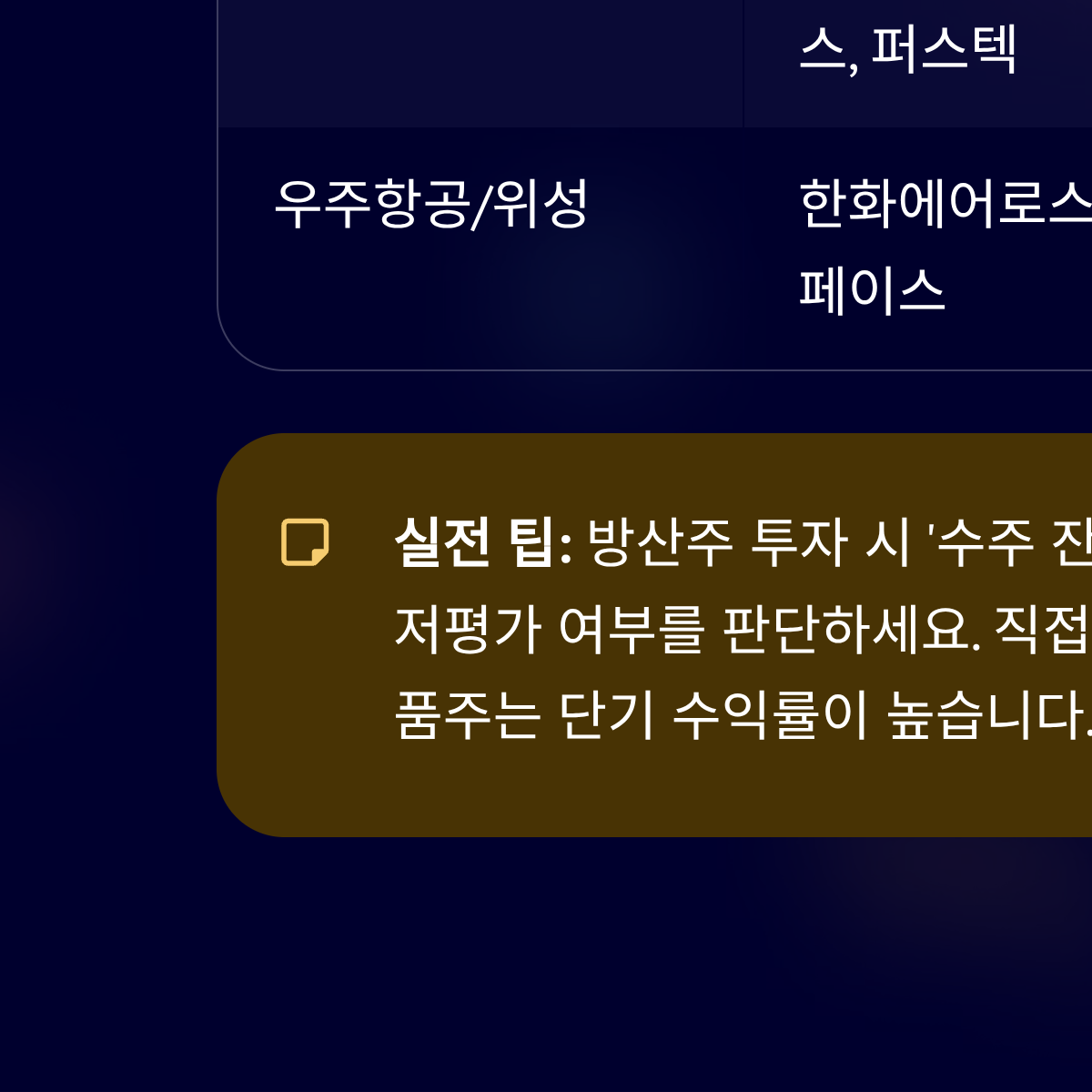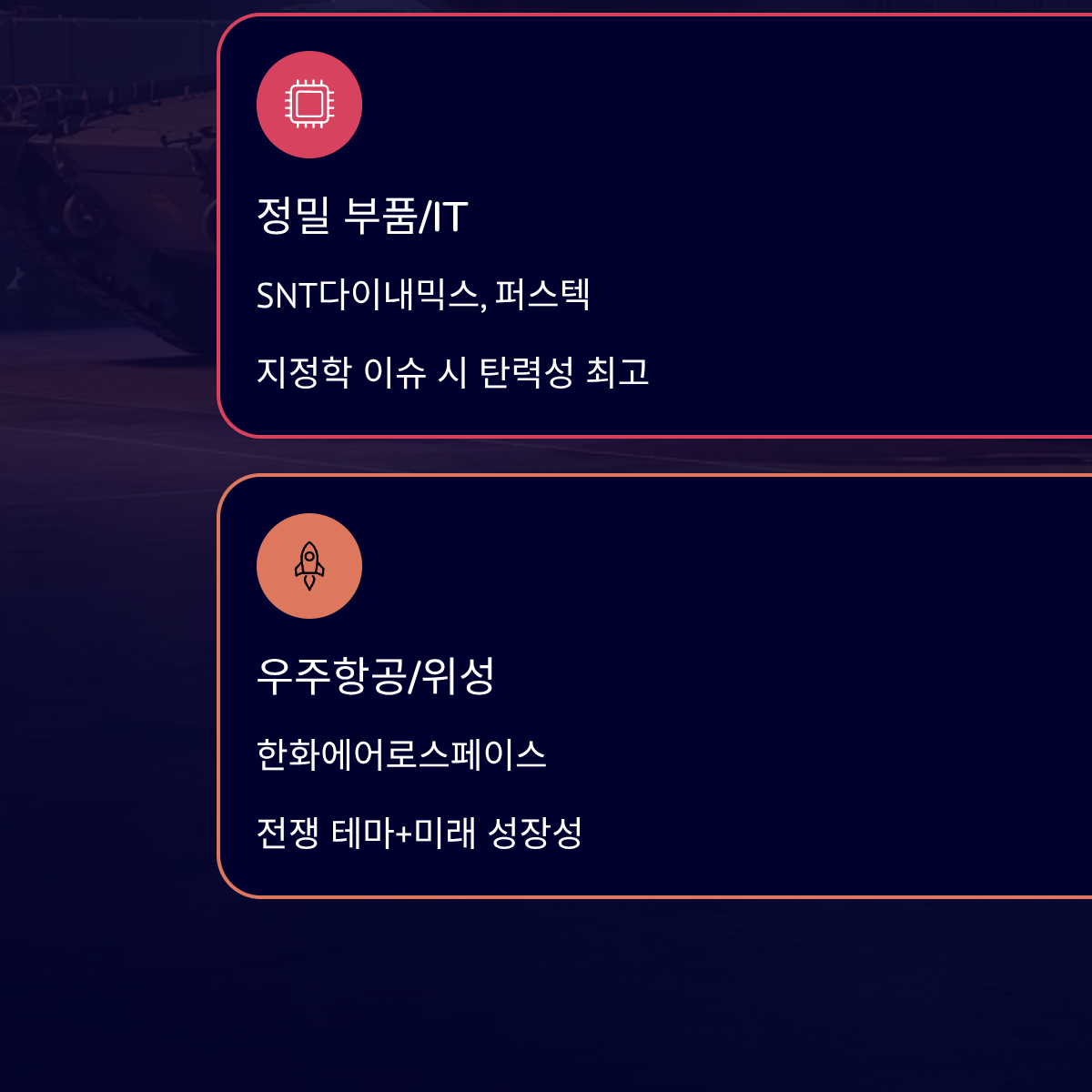 | 우주항공/위성 | 한화에어로스페이스 | 스페이스X 등 글로벌 파트너십 및 발사 일정 | ★★★★☆ | 전쟁 테마와 미래 성장성이 결합된 형태 |