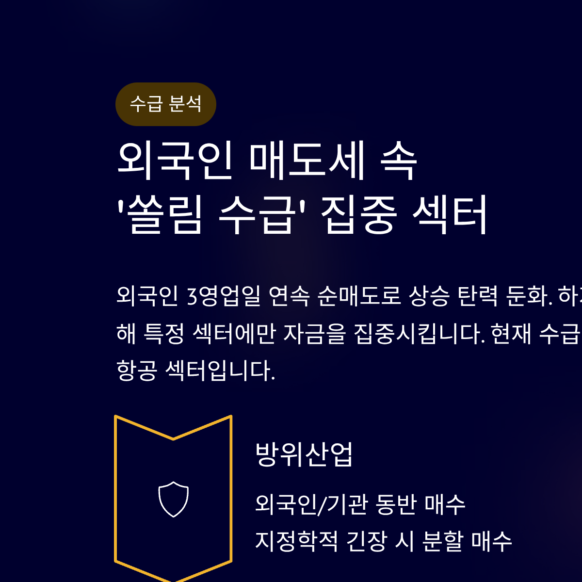 | 방위산업 | 외국인/기관 동반 매수 | 지정학적 긴장 고조 시 분할 매수 | 리스크 헤지 1순위 |