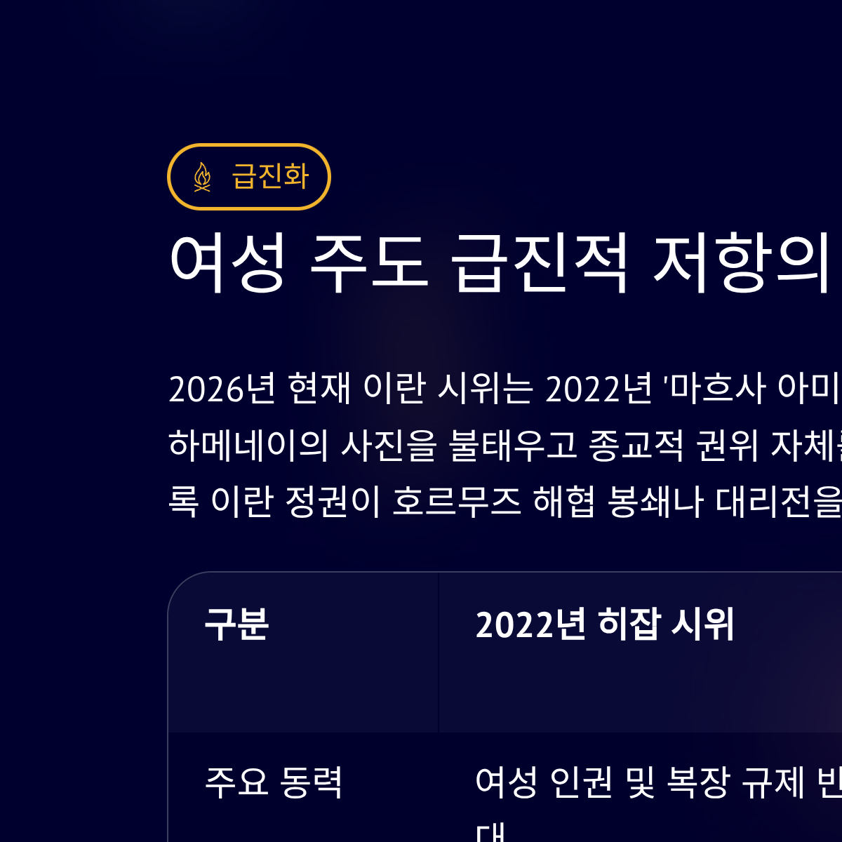 | 구분 | 2022년 히잡 시위 | 2026년 현재 반정부 시위 | 핵심 판단 기준 |