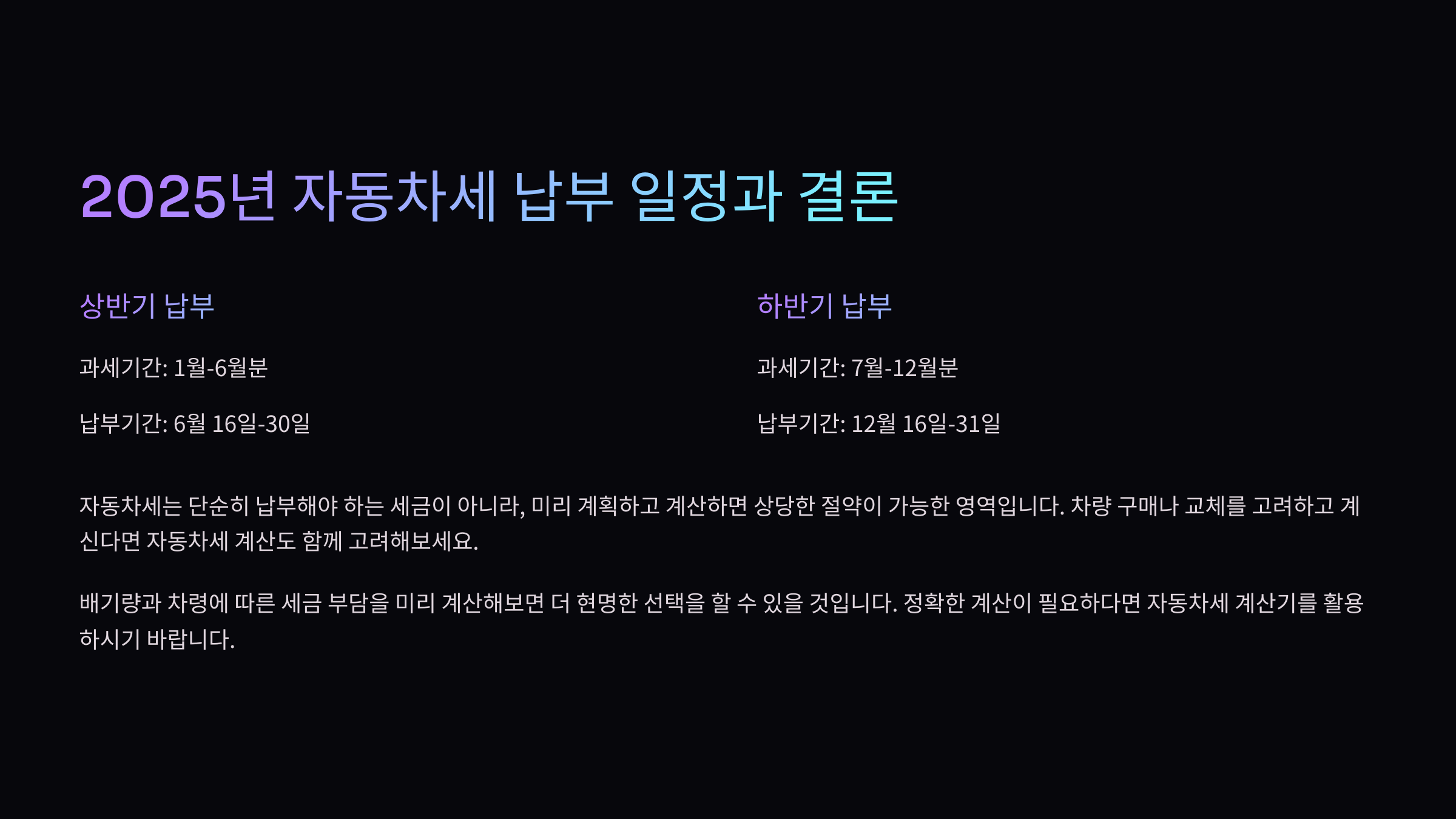 이 정보들을 입력하면 차령별 감액율이 자동으로 적용되어 정확한 연간 자동차세와 상반기/하반기 납부금액을 확인할 수 있습니다.