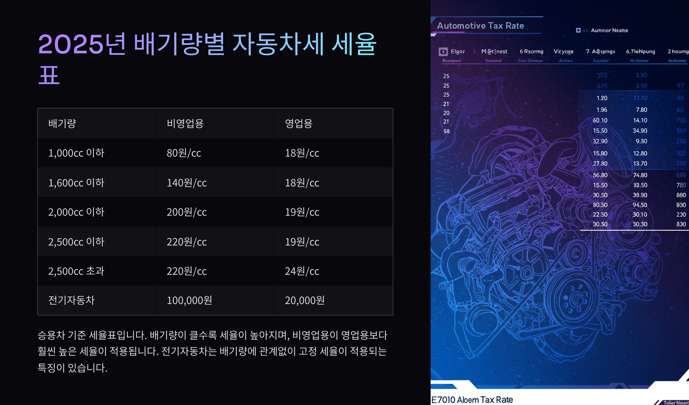 자동차세 계산이 복잡해서 고민이세요? 2025년 최신 자동차세 세율표와 차령별 감액 정보로 정확한 세금을 계산하고 절약하는 방법을 알아보세요. 배기량별 세율부터 전기차 특례까지 모든 정보를 한번에 확인하세요.