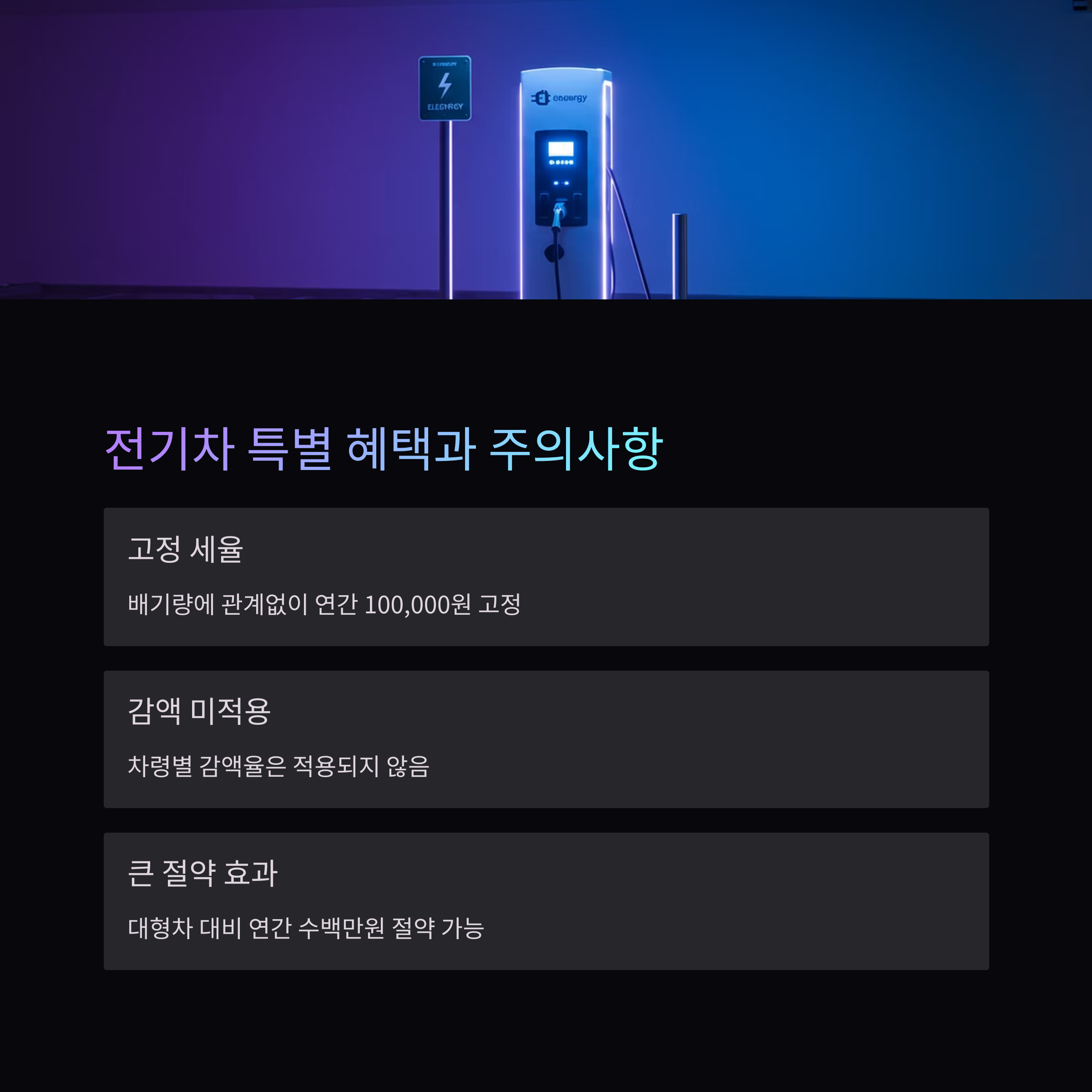 전기자동차는 배기량에 관계없이 연간 100,000원의 고정 세율이 적용됩니다. 하지만 차령별 감액은 적용되지 않으니 참고하세요.