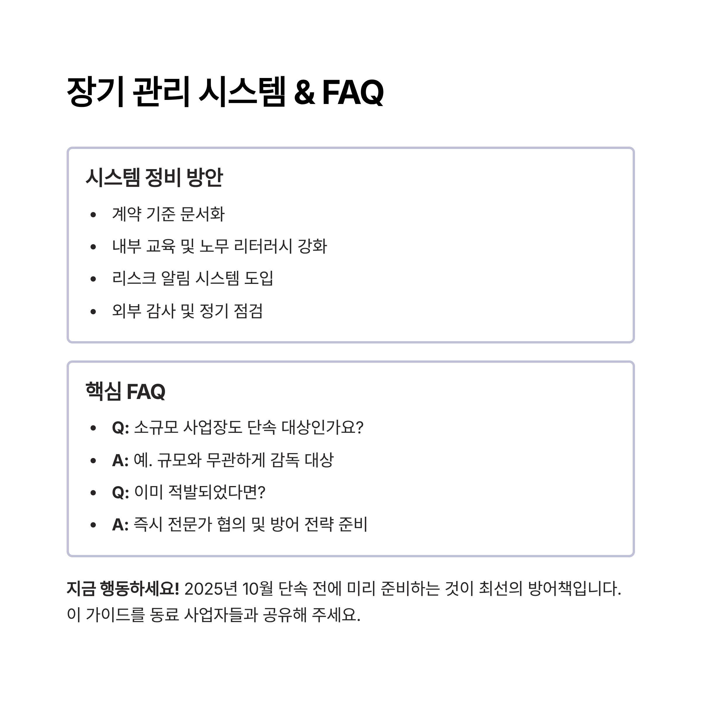 - 내부 교육 및 노무 리터러시 강화: 사업주와 실무자 대상 노동법 교육