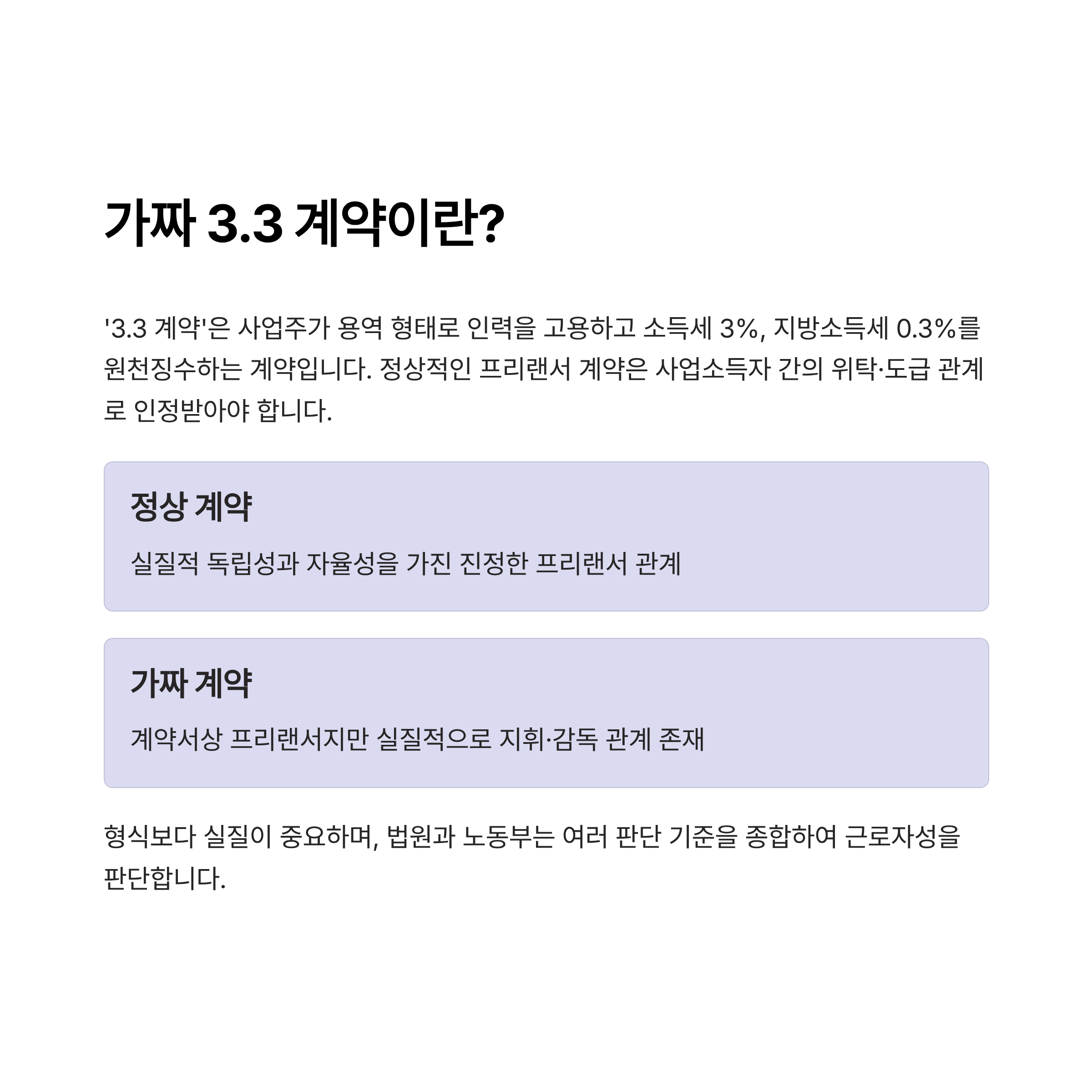 그러나 실제로는 계약서에 ‘프리랜서’라 적었지만 사업주가 출퇴근 시간, 업무 방식, 근무 장소를 지정하고 통제하는 등 실질적인 지휘·감독 관계가 존재할 때, 이는 법적으로 ‘가짜 3.3 계약’으로 판단됩니다.