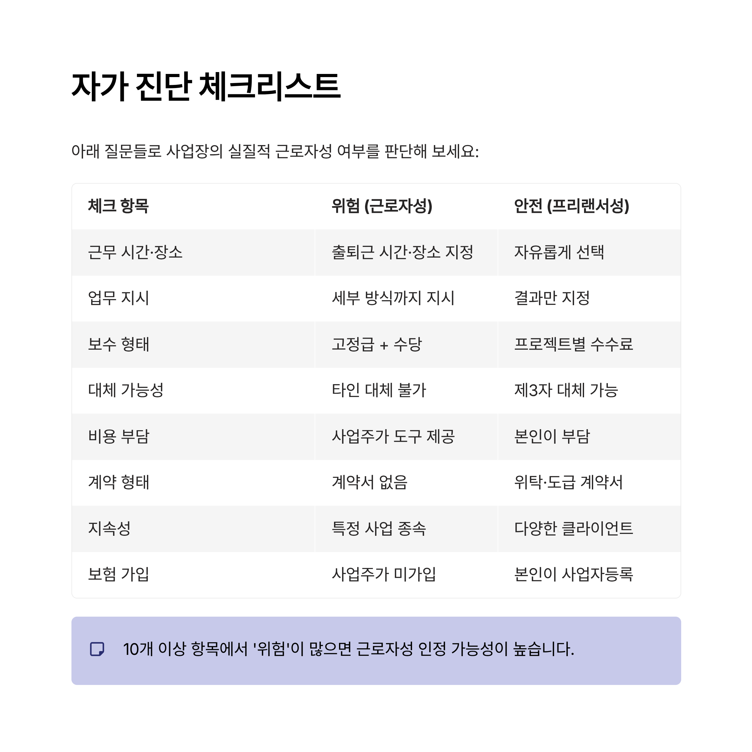- 계약 기준 문서화: 프리랜서인지 근로자인지 구분하는 기준을 문서화