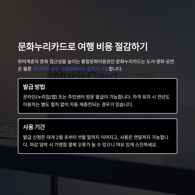 문화누리카드: 기초생활수급자·차상위계층 등에 연 14만 원 상당의 문화·관광·체육 사용 한도를 부여, 국내여행 가맹점에서도 활용 가능.