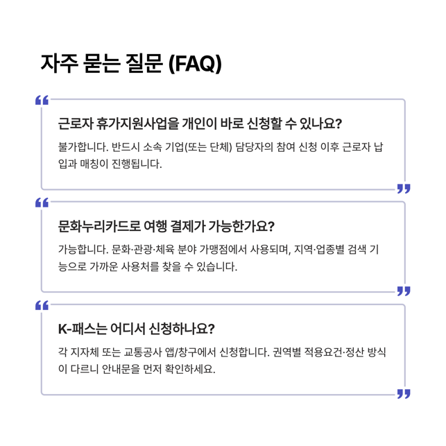 1) 재현성: 제도화된 지원(근로자 휴가지원·문화누리)은 예산에 기반해 매년 구조적으로 반복됩니다. 한 번 익혀 두면 다음 해에도 응용이 가능하죠.