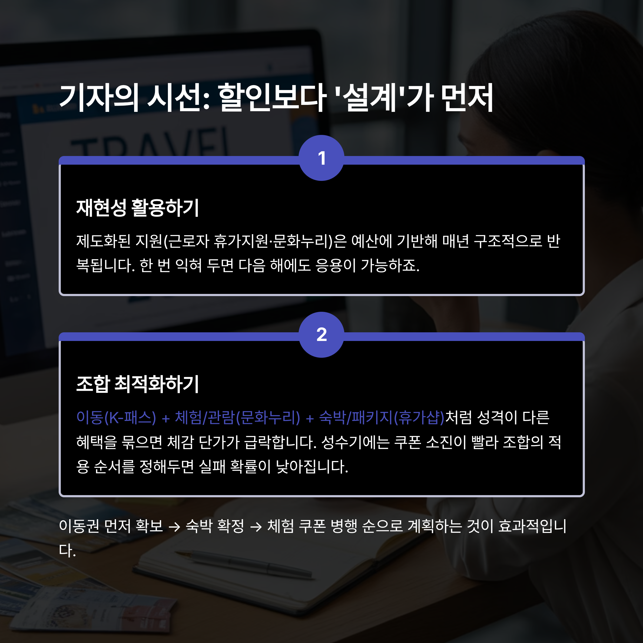 2) 조합 최적화: 이동(K-패스) + 체험/관람(문화누리) + 숙박/패키지(휴가샵)처럼 성격이 다른 혜택을 묶으면 체감 단가가 급락합니다. 성수기에는 쿠폰 소진이 빨라 조합의 적용 순서(이동권 먼저 확보 → 숙박 확정 → 체험 쿠폰 병행)를 정해두면 실패 확률이 낮아집니다.