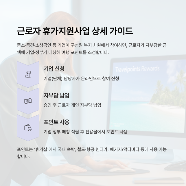 중소·중견·소상공인 등 기업이 구성원 복지 차원에서 참여하면, 근로자가 자부담한 금액에 기업·정부가 매칭해 여행 포인트를 조성합니다. 포인트는 전용 쇼핑몰(일명 ‘휴가샵’)에서 국내 숙박, 철도·항공·렌터카, 패키지/액티비티 등에 쓸 수 있습니다. 누적 참여 이력이 긴 기업에는 분담 비율이 달라지는 모델이 별도로 제공되기도 합니다.