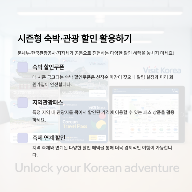 문체부·한국관광공사·지자체가 공동으로 진행하는 숙박 할인쿠폰·지역관광패스·축제 연계 할인은 매 시즌 공고됩니다. 선착순 마감이 잦으니 알림 설정과 미리 회원가입이 안전합니다.