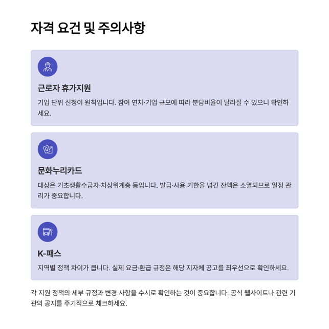 · 근로자 휴가지원: 기업 단위 신청이 원칙. 참여 연차·기업 규모에 따라 분담비율이 달라질 수 있습니다.