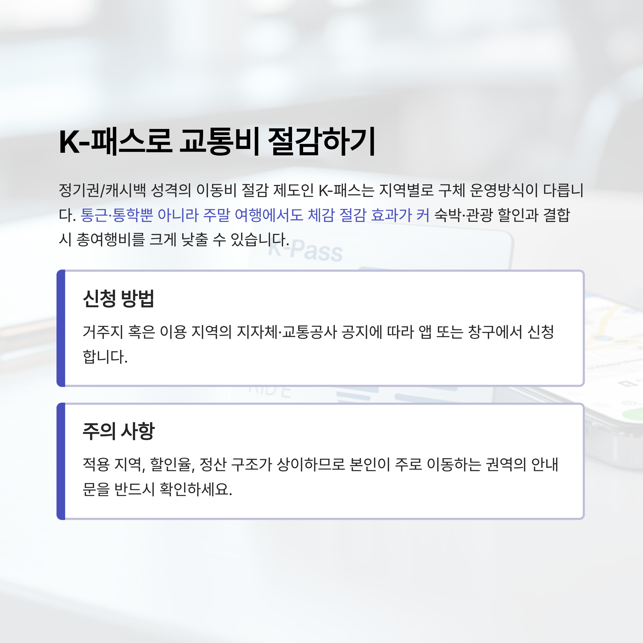 K-패스: 지역·기관별 운영되는 대중교통 비용 경감 정책. 주중·주말 외출 및 여행 시 이동비 절감에 효과적.
