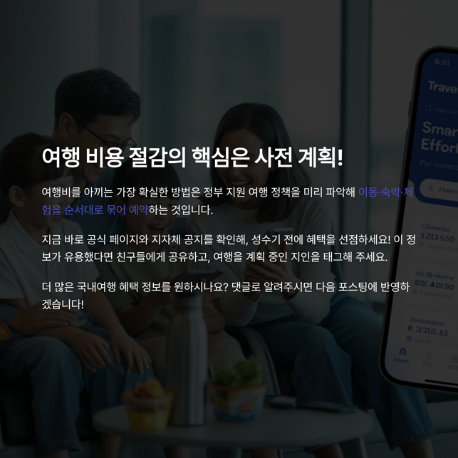 여행비를 아끼는 가장 확실한 방법은 정부 지원 여행 정책을 미리 파악해 이동·숙박·체험을 순서대로 묶어 예약하는 겁니다. 지금 바로 공식 페이지와 지자체 공지를 확인해, 성수기 전에 혜택을 선점하세요!