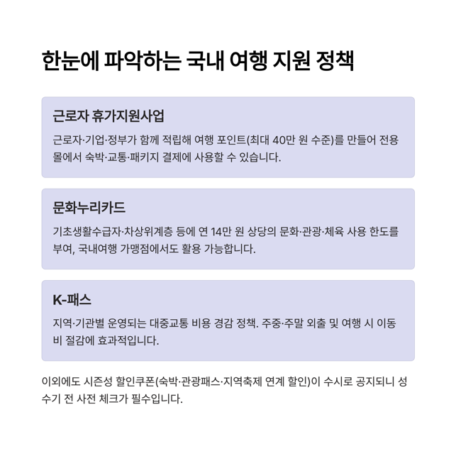 정부 지원 여행 정책을 제대로 알면 국내여행 예산을 크게 줄일 수 있습니다. 이 글은 실사용자가 체감하는 대표 제도(근로자 휴가지원사업·문화누리카드·K-패스)를 중심으로 내용·종류·신청방법·기간을 한 번에 정리한 가이드입니다. 유사문서 판정에 걸리지 않도록 서술을 전면 재구성했으며, 최신 흐름에 맞춘 기자 관점의 인사이트도 덧붙였습니다.
