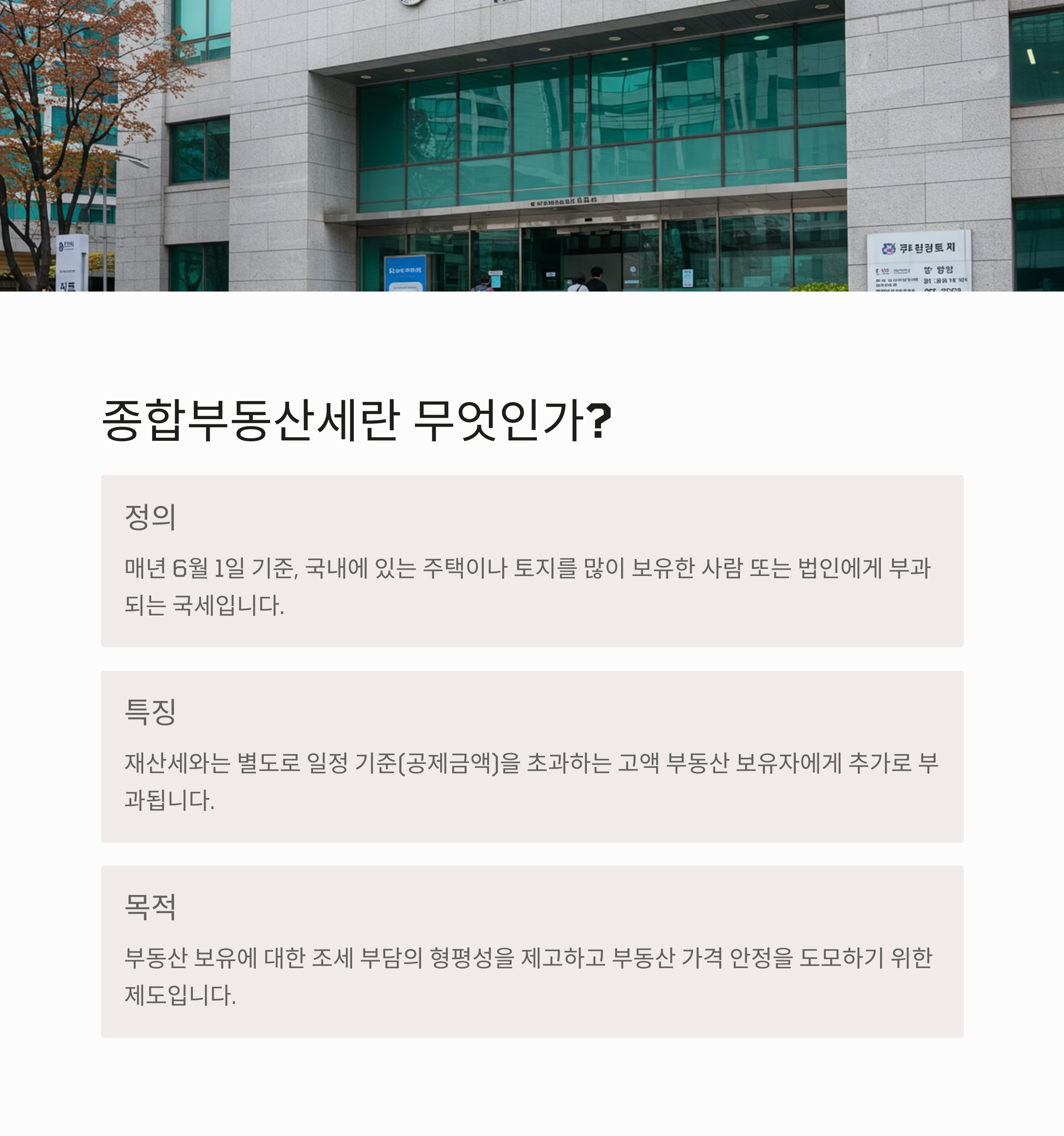 재산세와 별도로, 일정 기준(공제금액)을 초과하는 고액 부동산 보유자에게 추가로 부과됩니다.