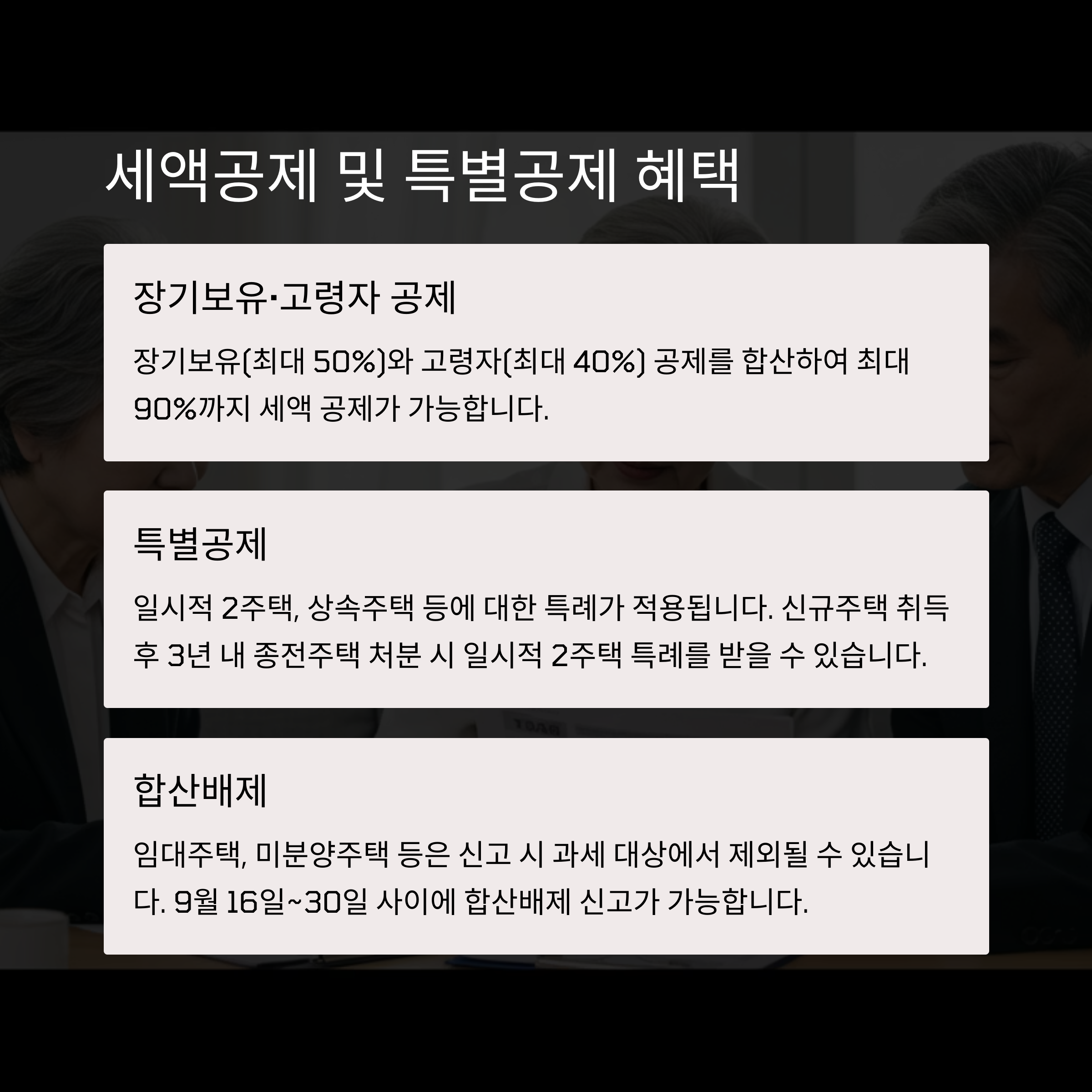 - 특별공제: 일시적 2주택, 상속주택 등 특례 적용 가능.