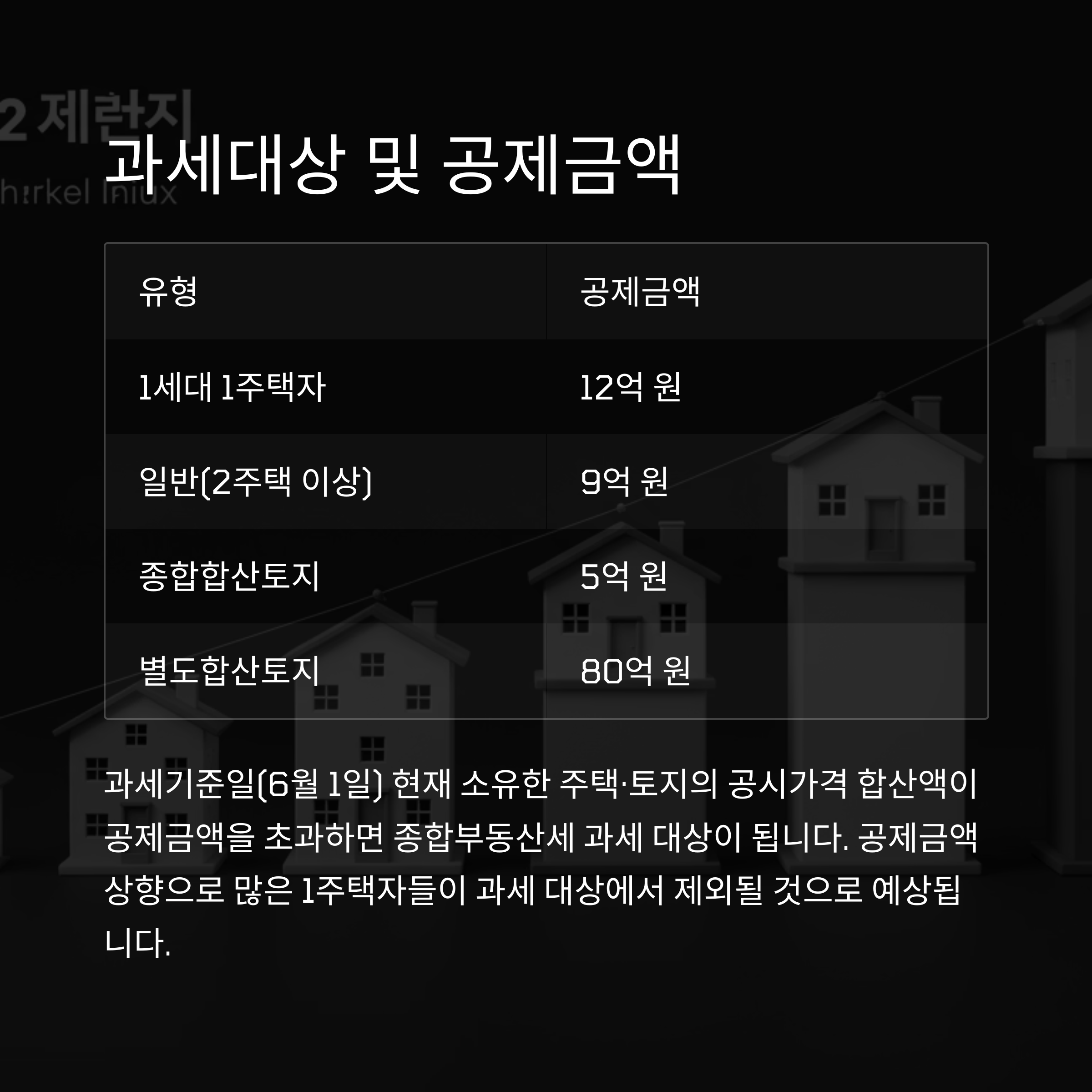 - 과세기준일(6월 1일) 현재 소유한 주택·토지의 공시가격 합산액이 공제금액을 초과하면 과세 대상입니다.