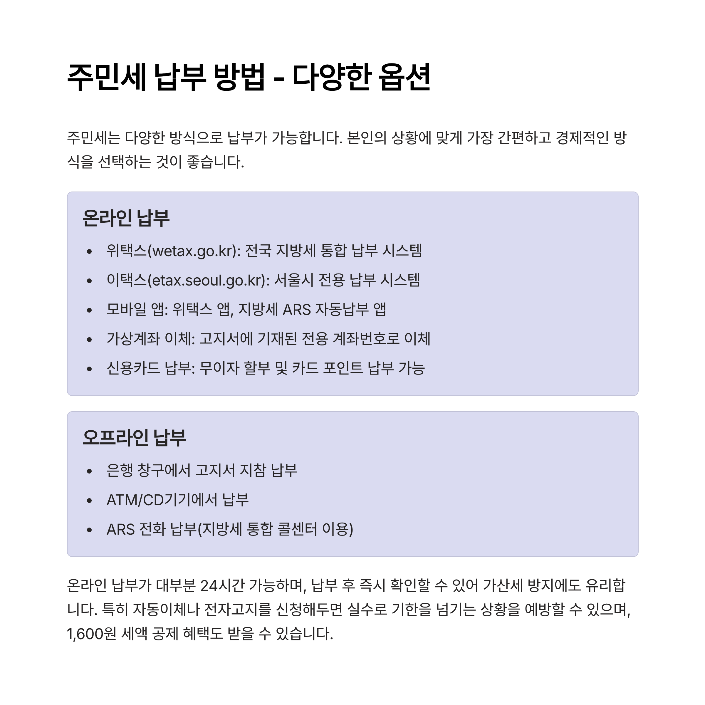 주민세는 다양한 방식으로 납부가 가능합니다. 본인의 상황에 맞게 가장 간편하고 경제적인 방식을 선택하는 것이 좋습니다.