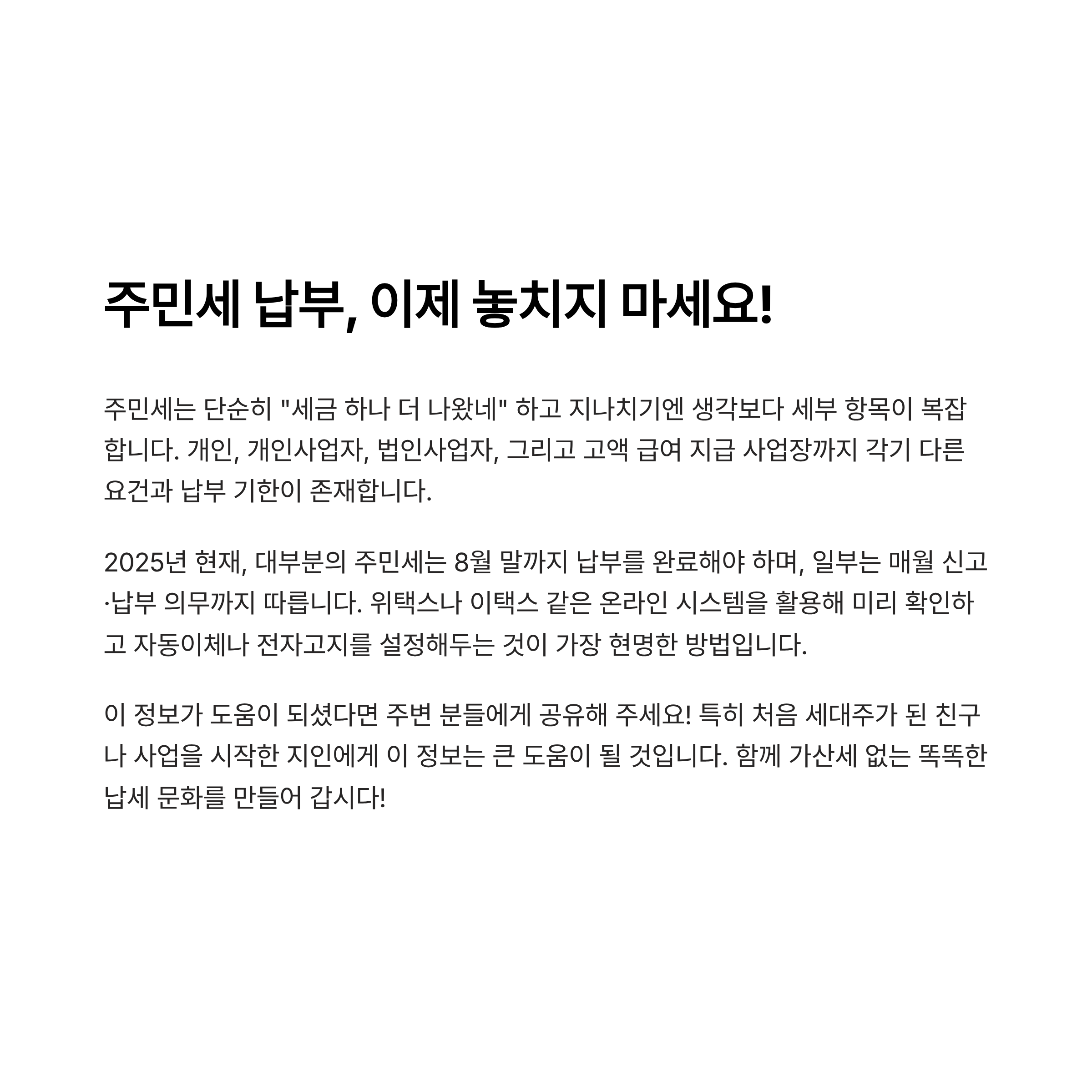 안녕하세요. 작년 여름에 주민세 고지서를 못 받아서 뒤늦게 납부한 경험이 있습니다. 그때 느낀 점은 ‘미리 정확히 알아두는 게 가장 좋다’는 것이었어요. 이번 글에서는 개인과 사업자 모두에게 해당되는 2025년 주민세 납부 대상 및 절차를 핵심만 정리해드립니다. 가산세 없이 스마트하게 납부하려면 지금 꼭 확인하세요!