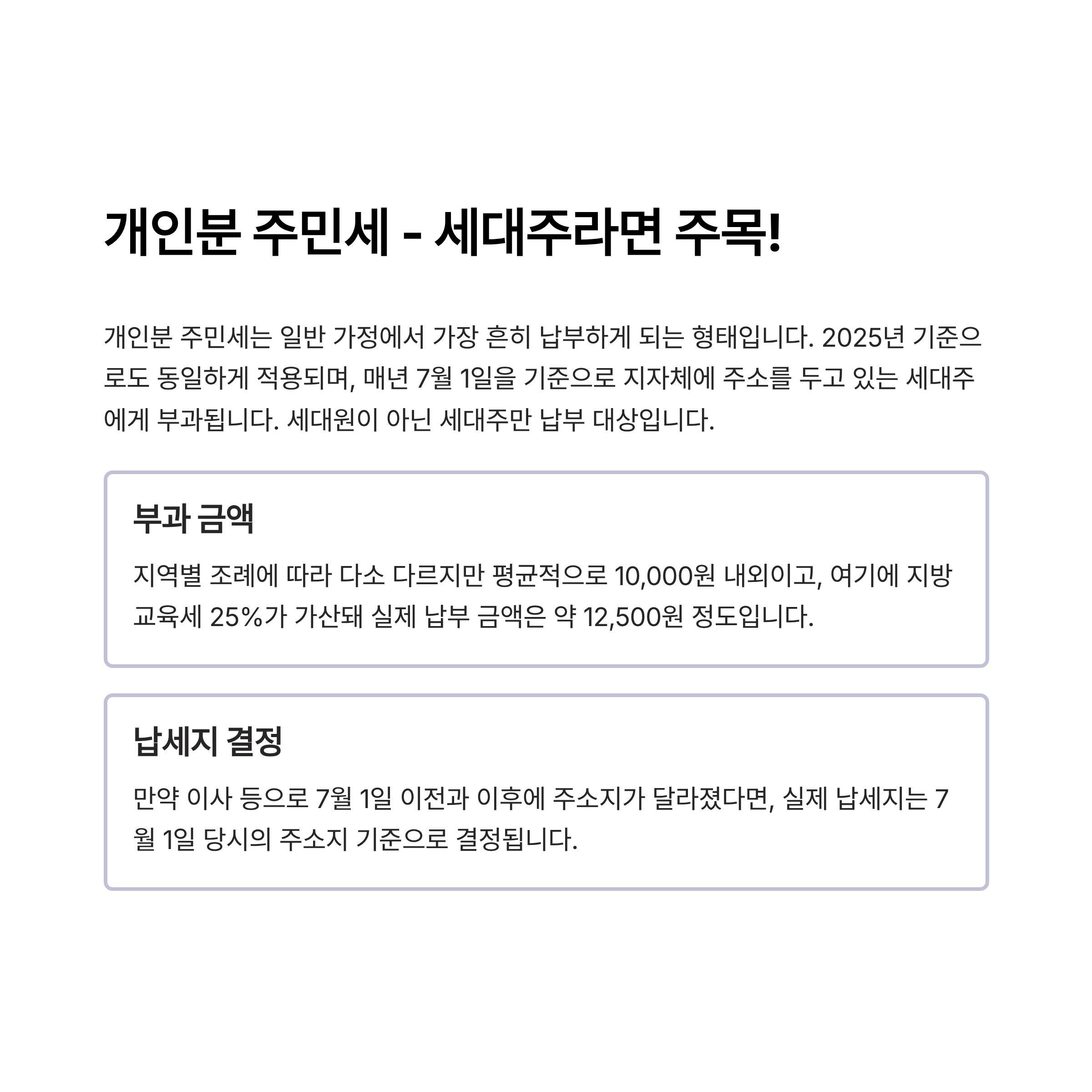 개인분 주민세는 일반 가정에서 가장 흔히 납부하게 되는 형태입니다. 2025년 기준으로도 동일하게 적용되며, 매년 7월 1일을 기준으로 지자체에 주소를 두고 있는 세대주에게 부과됩니다. 즉, 세대원이 아닌 사람은 납부 대상이 아닙니다.
