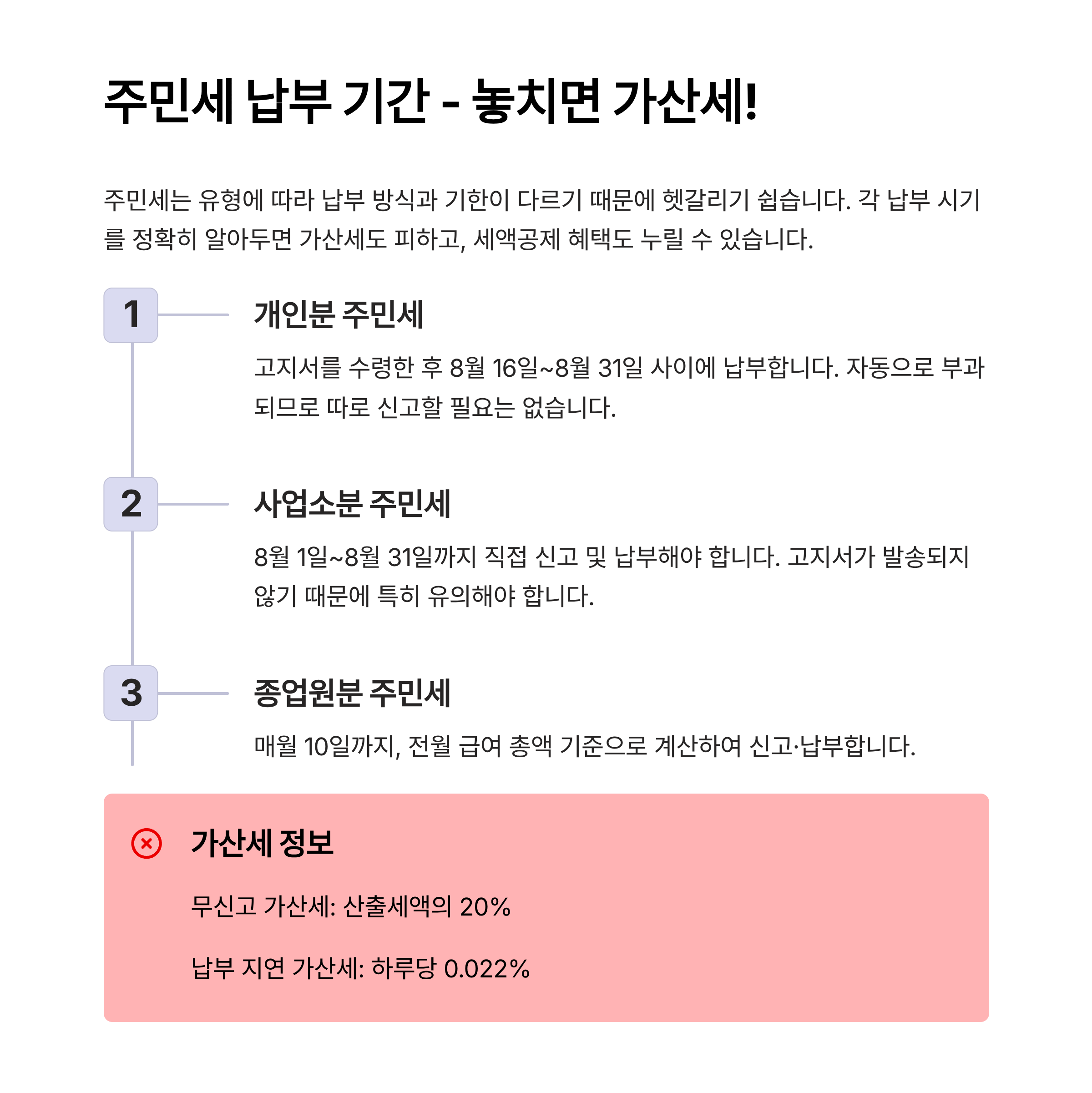 • 사업소분 주민세: 8월 1일~8월 31일까지 직접 신고 및 납부해야 합니다. 고지서가 발송되지 않기 때문에 특히 유의해야 합니다.