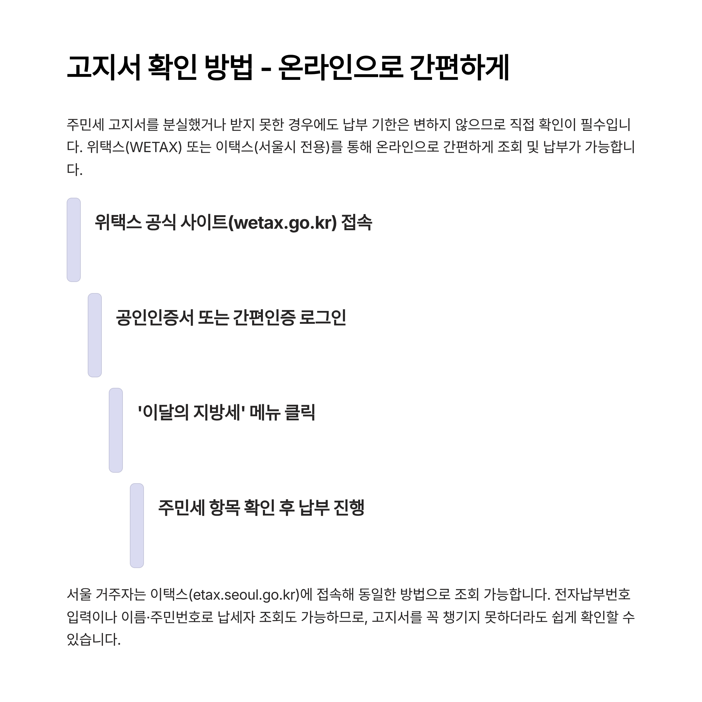 서울 거주자는 이택스(etax.seoul.go.kr)에 접속해 동일한 방법으로 조회 가능합니다.