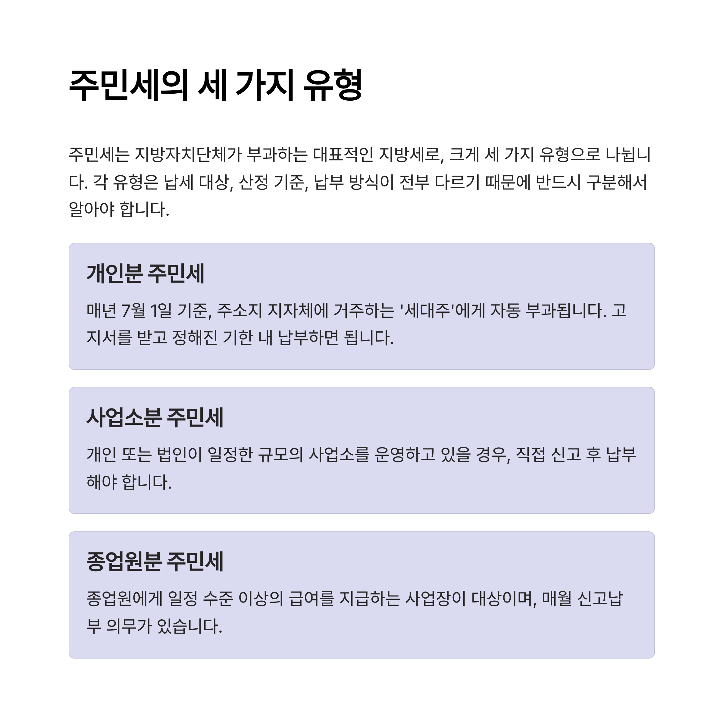 2025년 기준 주민세는 지방자치단체가 부과하는 대표적인 지방세로, 크게 세 가지 유형으로 나뉩니다: 개인분, 사업소분, 종업원분입니다. 이 세 가지는 납세 대상, 산정 기준, 납부 방식이 전부 다르기 때문에 반드시 구분해서 알아야 합니다.