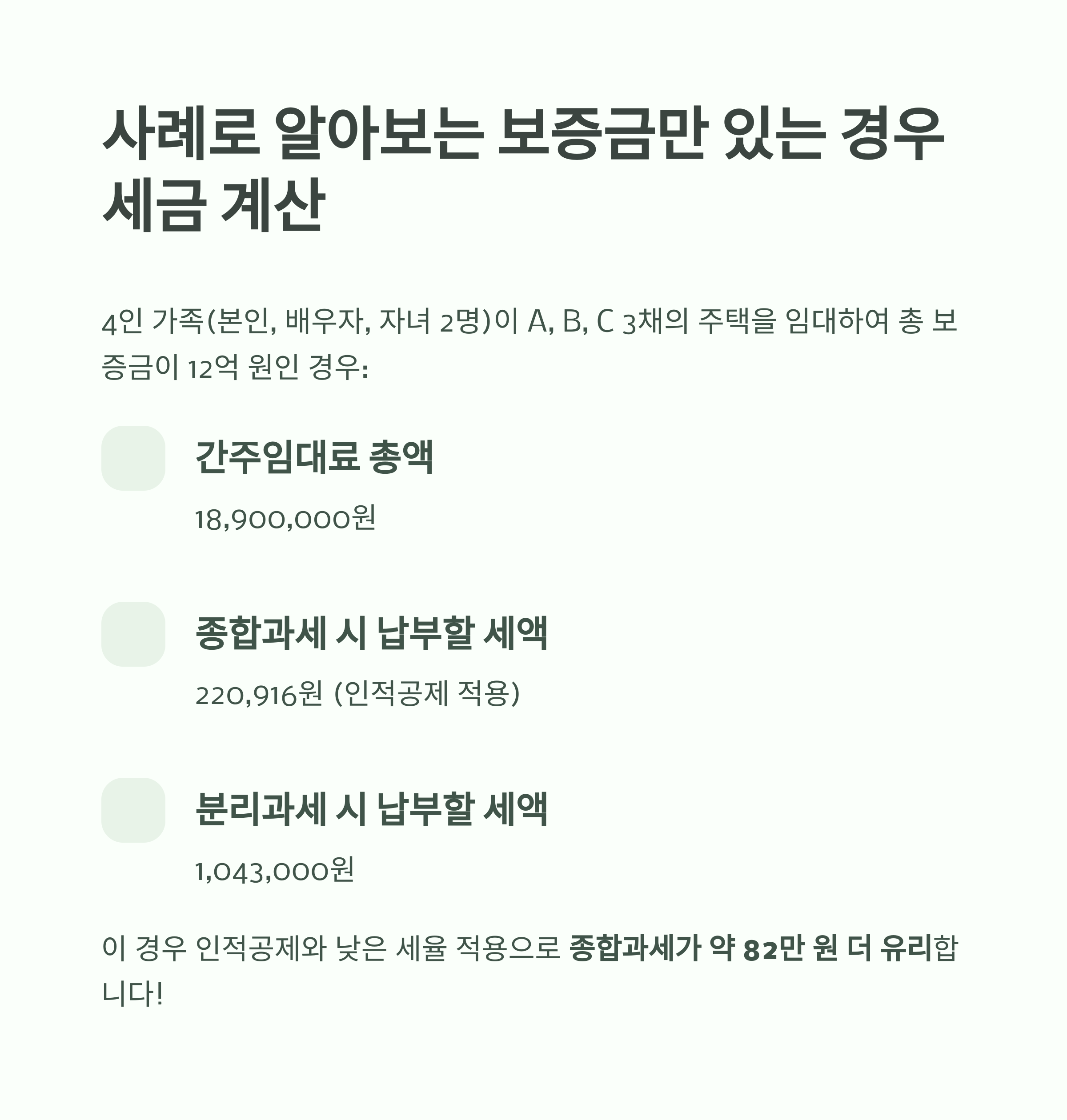 국세청에서 제공하는 실제 계산 사례를 통해 종합과세와 분리과세의 차이점을 알아보겠습니다. 아래는 4인 가족(본인, 배우자, 자녀 2명)이 주택을 임대한 경우의 세금 계산 예시입니다.