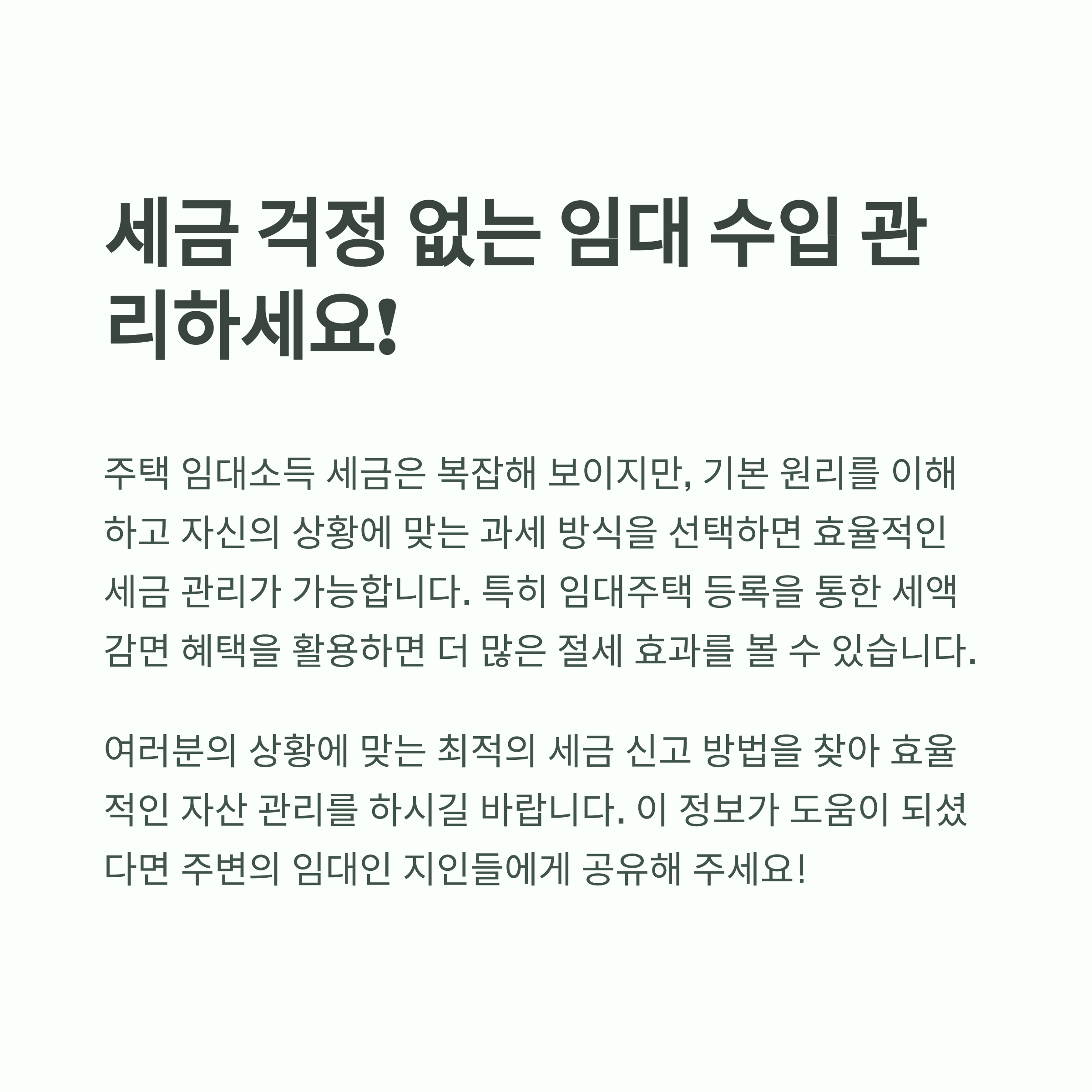 여러분의 상황에 맞는 최적의 세금 신고 방법을 찾아 효율적인 자산 관리를 하시길 바랍니다. 주택 임대소득 세금, 이제는 더 이상 어렵고 복잡한 문제가 아닙니다!
