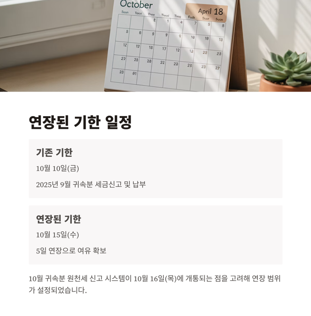 기존에는 2025년 9월 귀속분에 대한 세금신고 및 납부 기한이 10월 10일(금)이었습니다. 하지만 연휴 직후 업무 재개에 따른 혼선을 줄이기 위해 이 기한이 10월 15일(수)까지로 5일 연장되었습니다. 특히 10월 귀속분 원천세 신고 시스템이 10월 16일(목)에 개통되는 점을 고려해 연장 범위가 설정된 것입니다. 이는 신고와 납부 일정이 겹치지 않도록 설계된 것으로, 실질적인 행정 부담을 줄이고 신고 오류를 방지할 수 있게 됩니다.