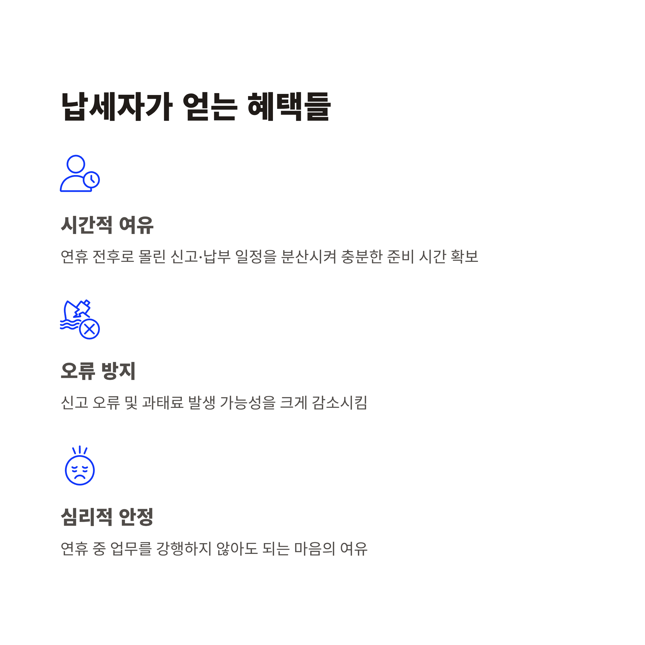 납세자가 얻을 수 있는 가장 큰 혜택은 시간적 여유입니다. 특히 개인사업자, 프리랜서, 법인 회계 담당자 등 다양한 납세자 그룹에게 다음과 같은 이점이 생깁니다.