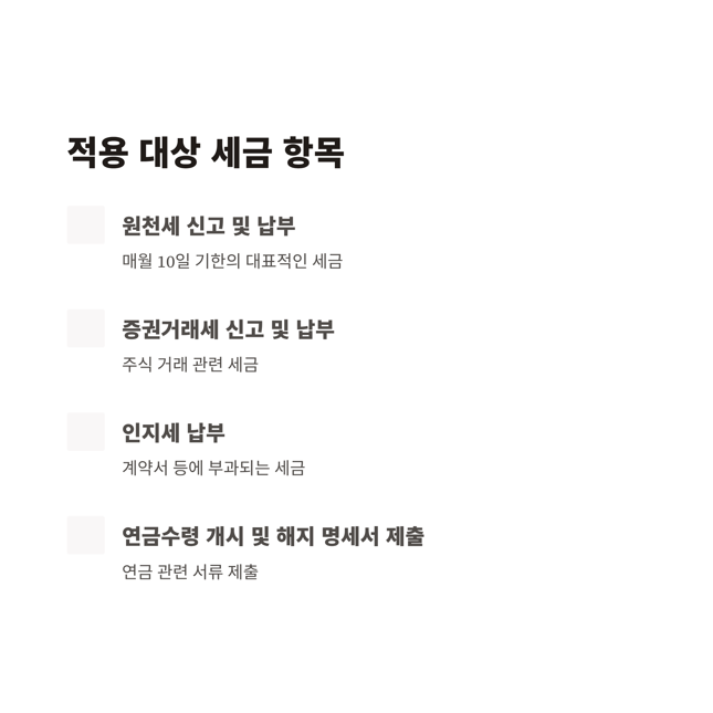 이번 기한 연장은 모든 세금에 적용되는 것은 아닙니다. 다음과 같은 항목에 한해 적용됩니다.