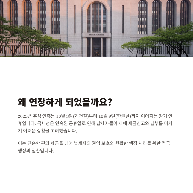 이번 2025년 추석 연휴에 맞춘 국세청의 세금신고 및 납부기한 연장은 단순한 날짜 변경 이상의 의미가 있습니다.