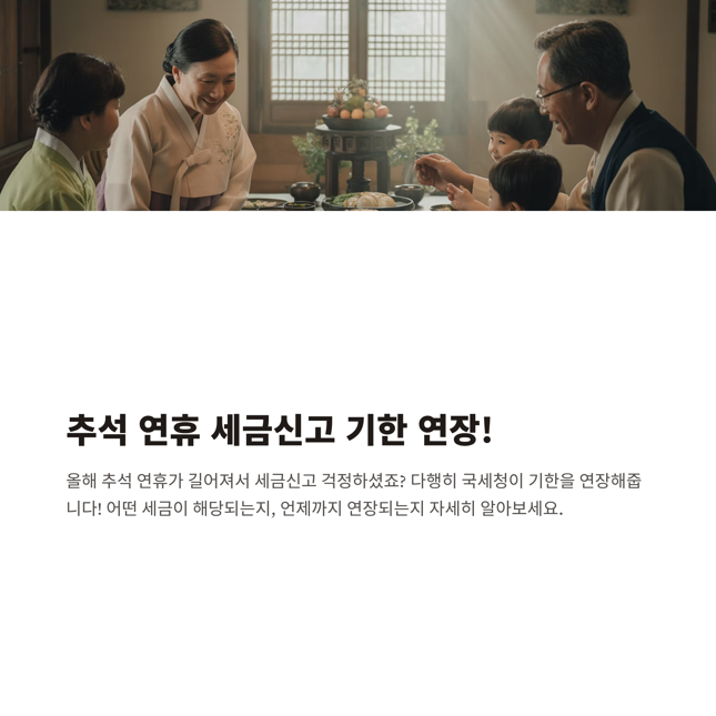 이번 추석은 부담 없이 가족과 함께 보내고, 연휴 후에도 충분한 시간으로 여유롭게 세무 업무를 처리하세요.