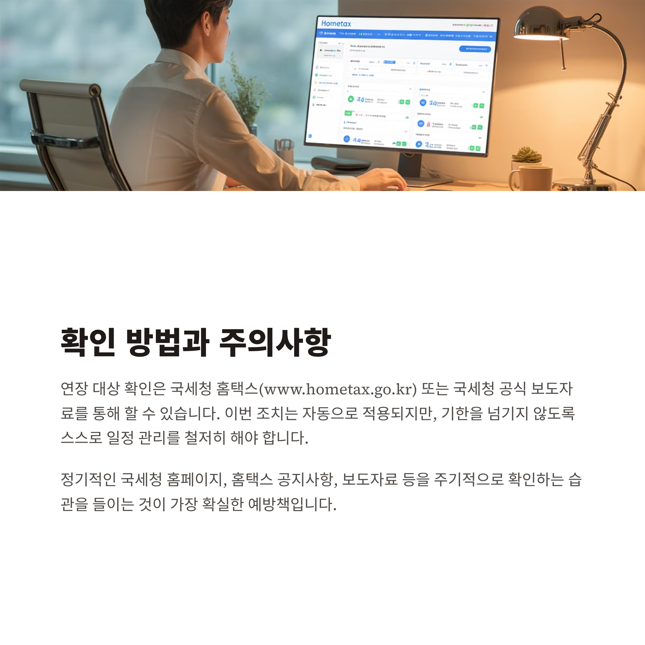 또한, 연장 조치가 있더라도 기한을 넘기지 않도록 스스로 일정 관리를 철저히 해야 하며, 홈택스 등의 시스템 확인도 필요합니다.