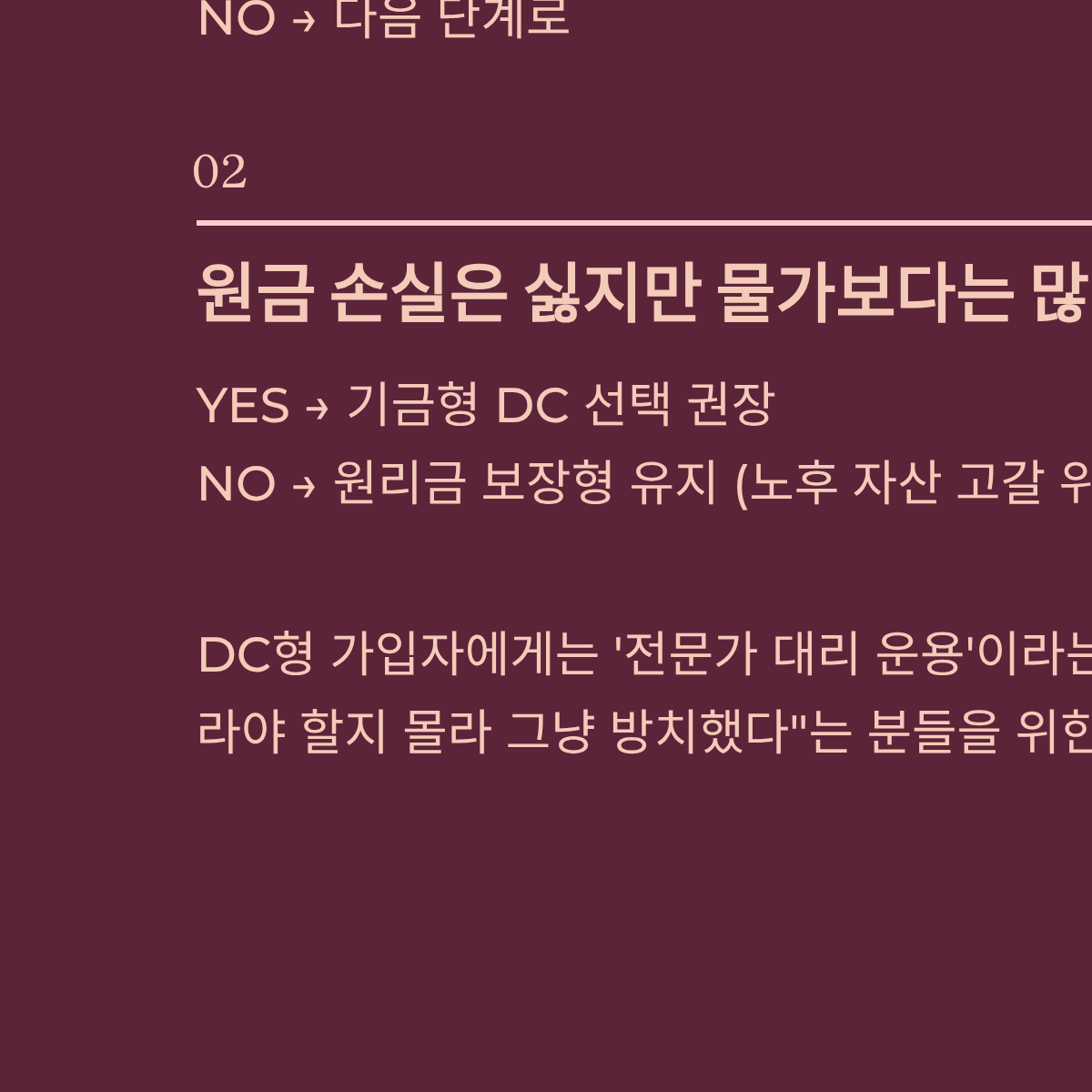 3. 원금 보장보다는 장기적인 노후 자산 증식이 우선인가? → 기금형 전환 권장