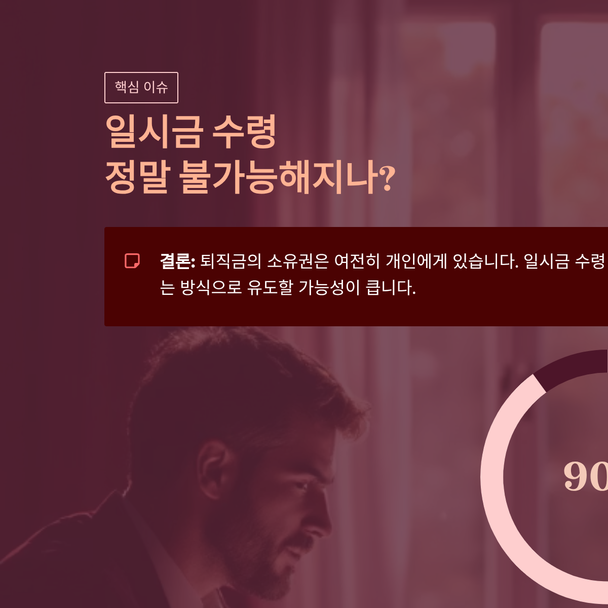 * 일시금 수령 자체가 금지되는 것은 아니나, 일시금 선택 시 발생하는 퇴직소득세 부담이 지금보다 상대적으로 높아질 수 있습니다.