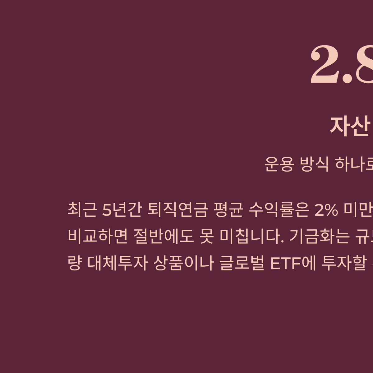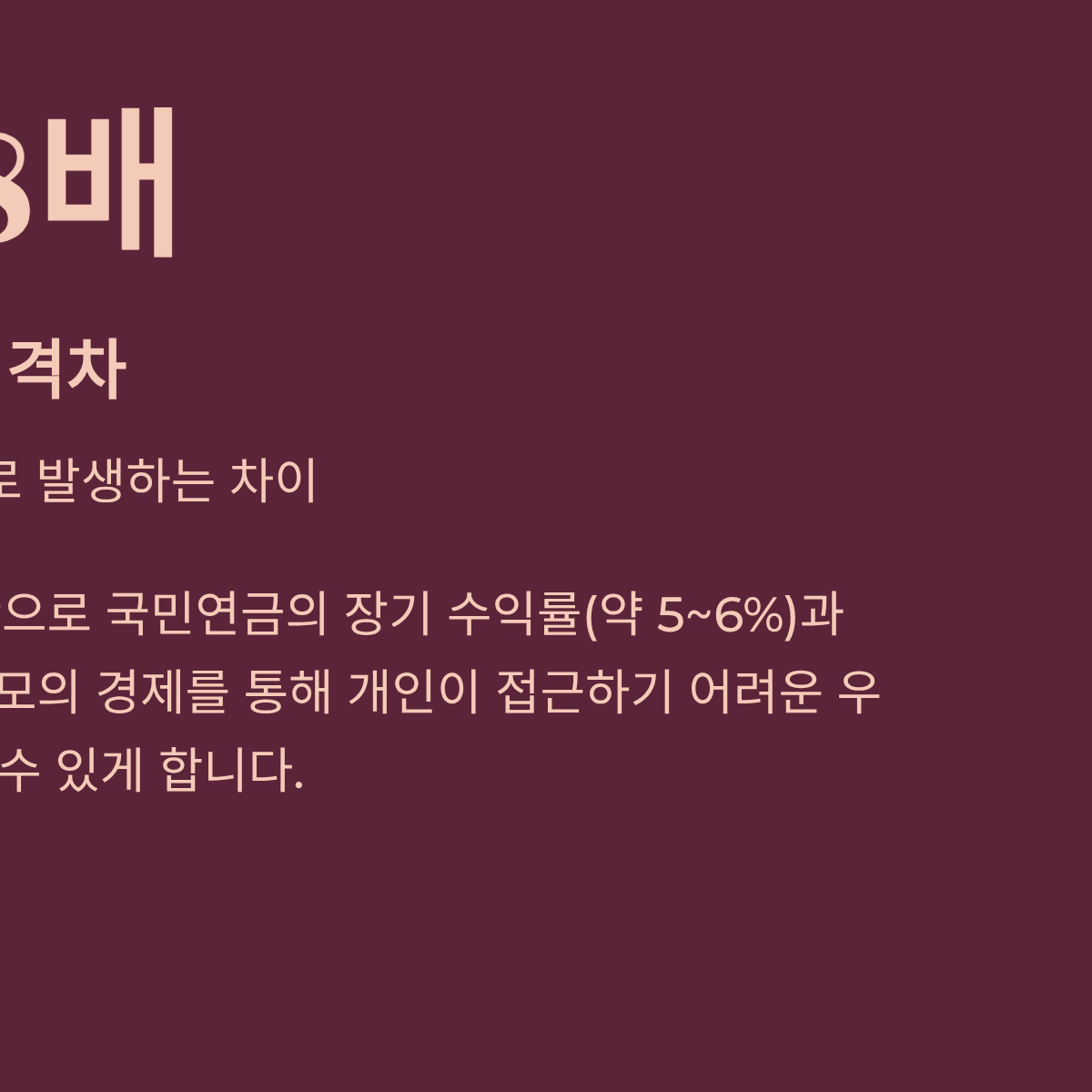 * 기금형은 국민연금처럼 대규모 자금을 굴리기 때문에 개인이 접근하기 어려운 해외 대체투자나 우량 채권에 분산 투자하여 변동성을 낮춥니다.