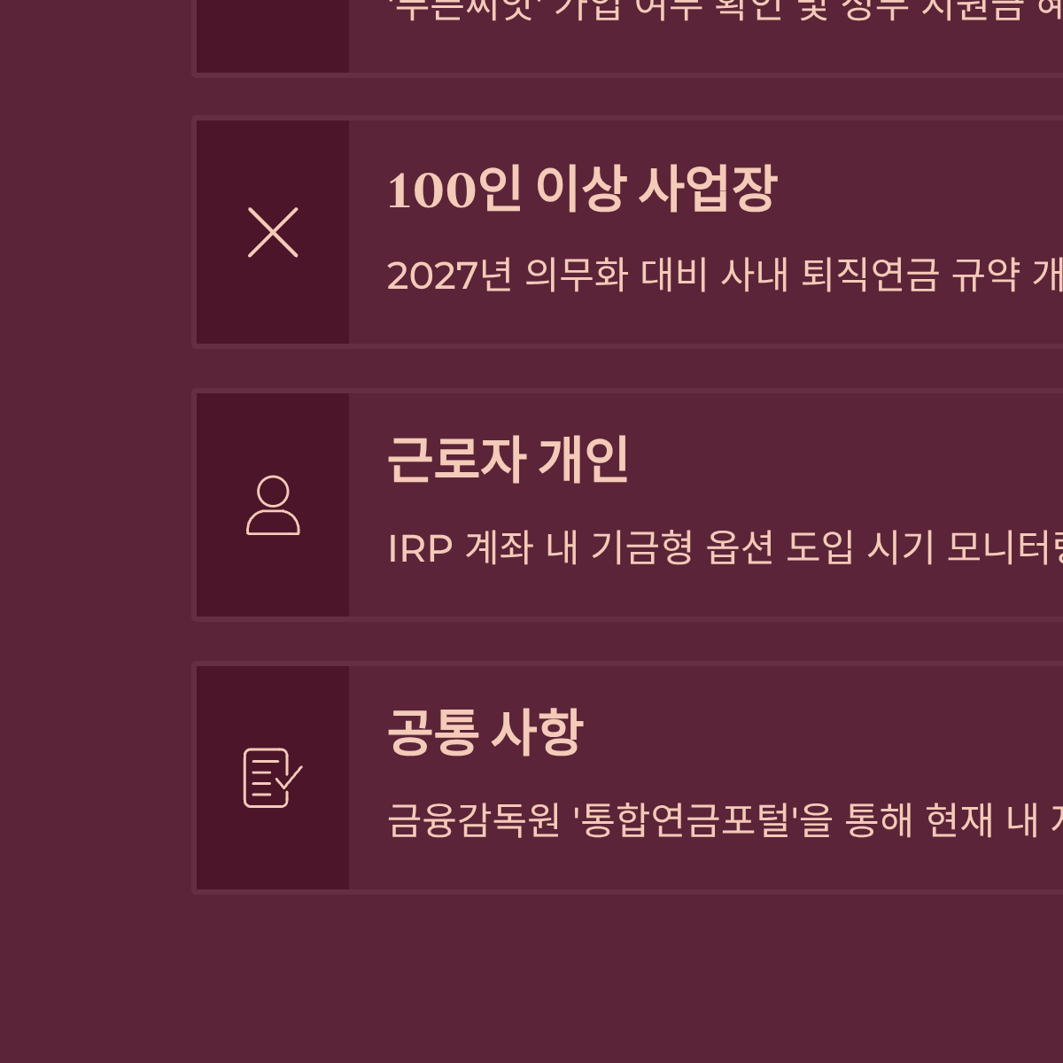 - [ ] 100인 이상 사업장: 2027년 의무화 대비 사내 퇴직연금 규약 개정 준비
