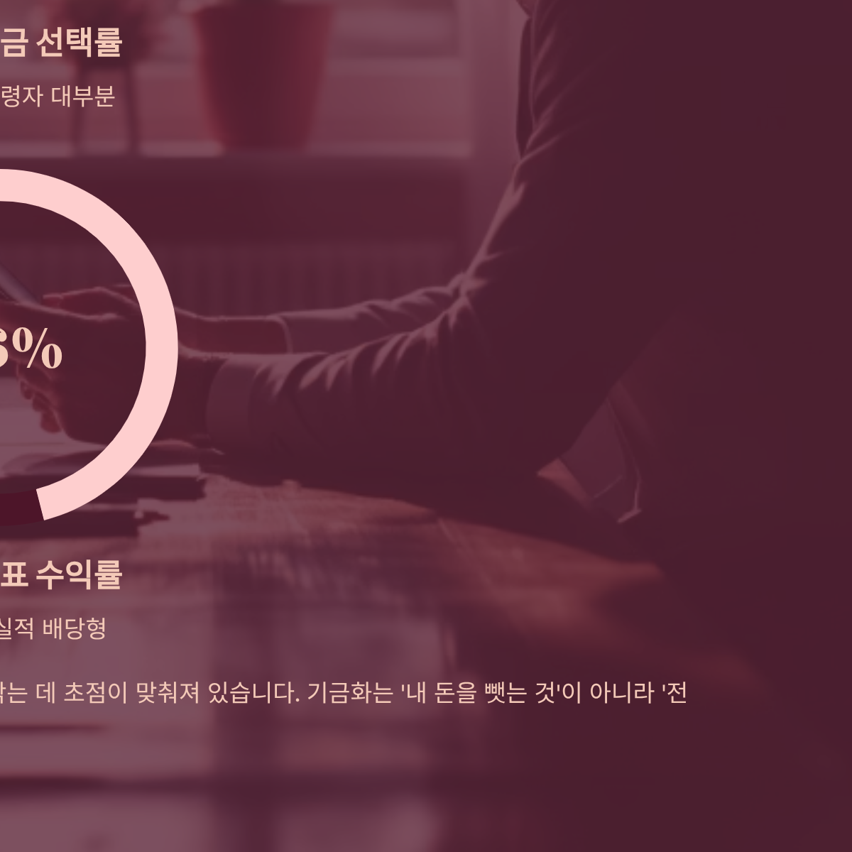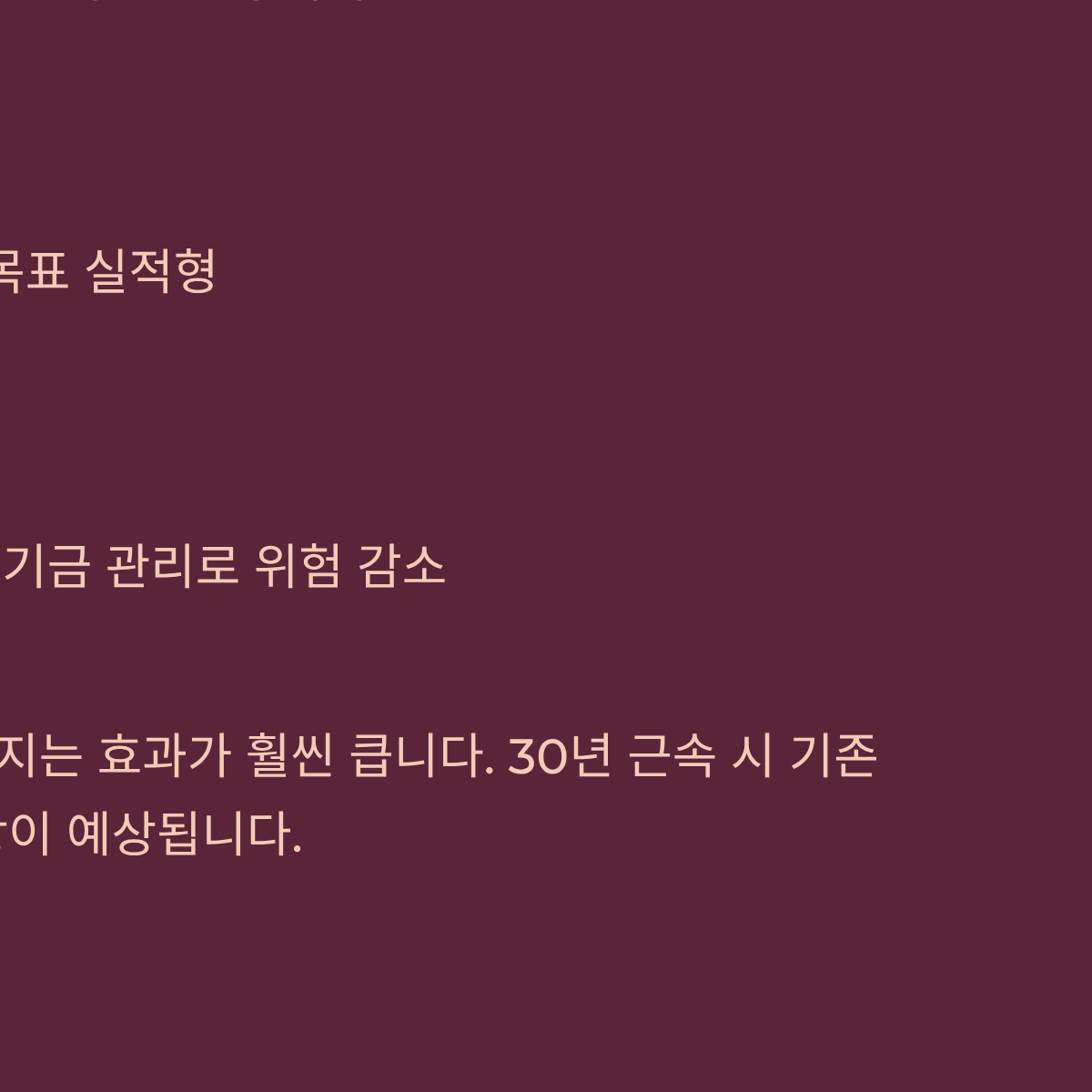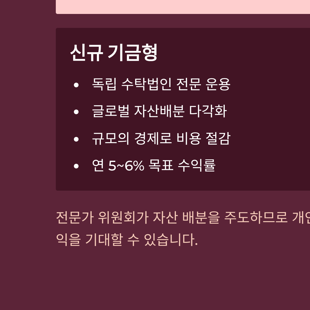 * 기금형은 전문가 위원회가 자산 배분을 주도하므로, 개인이 일일이 금융 공부를 하지 않아도 높은 수익을 기대할 수 있습니다.