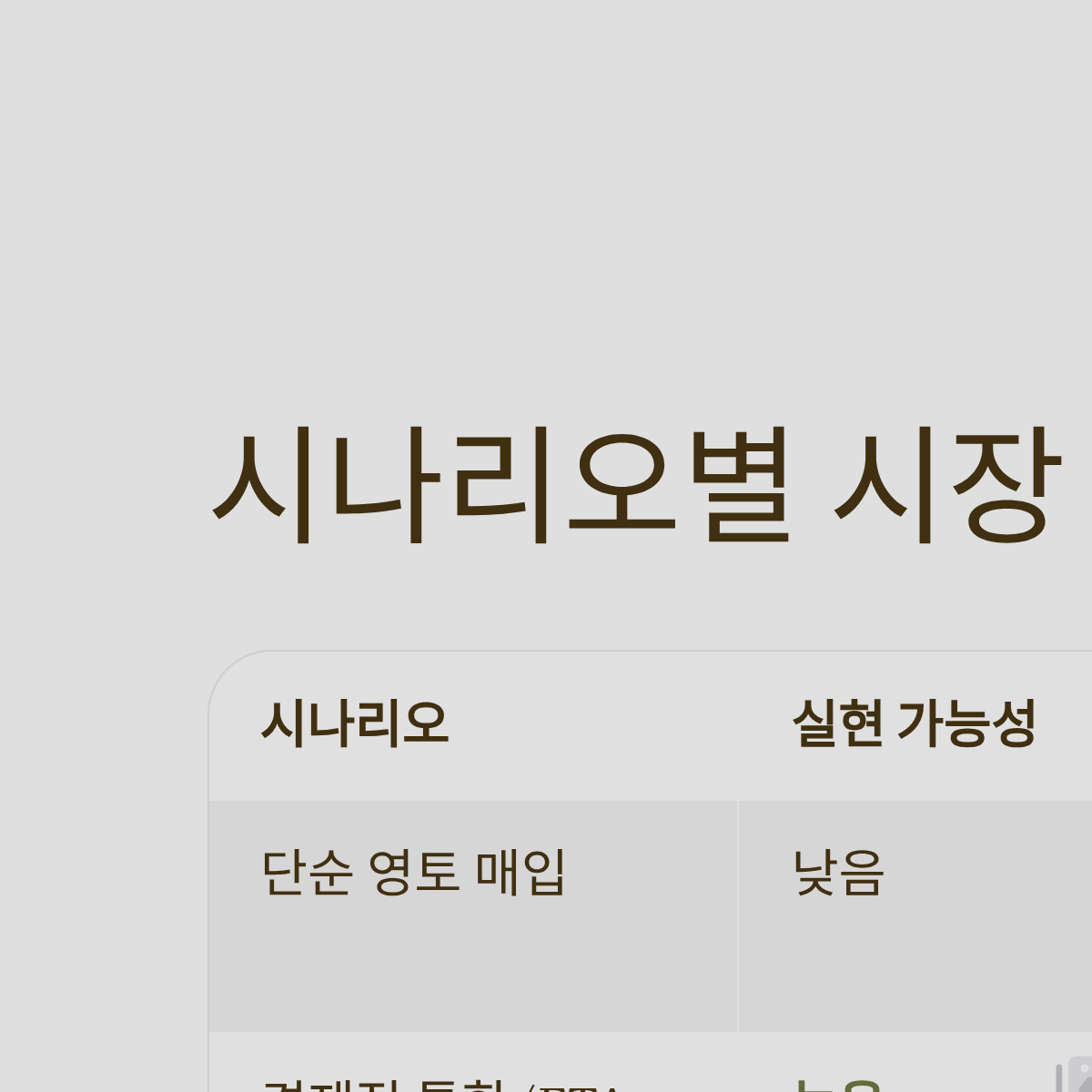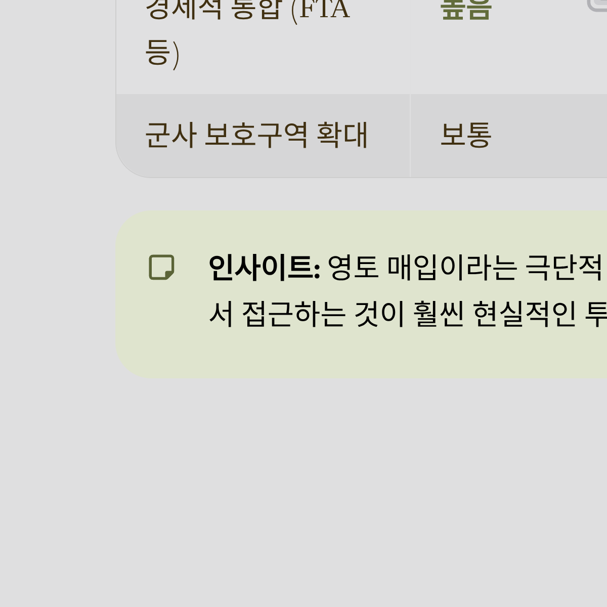 | 단순 영토 매입 | 낮음 | 덴마크의 주권 거부로 단기 악재 소멸 |