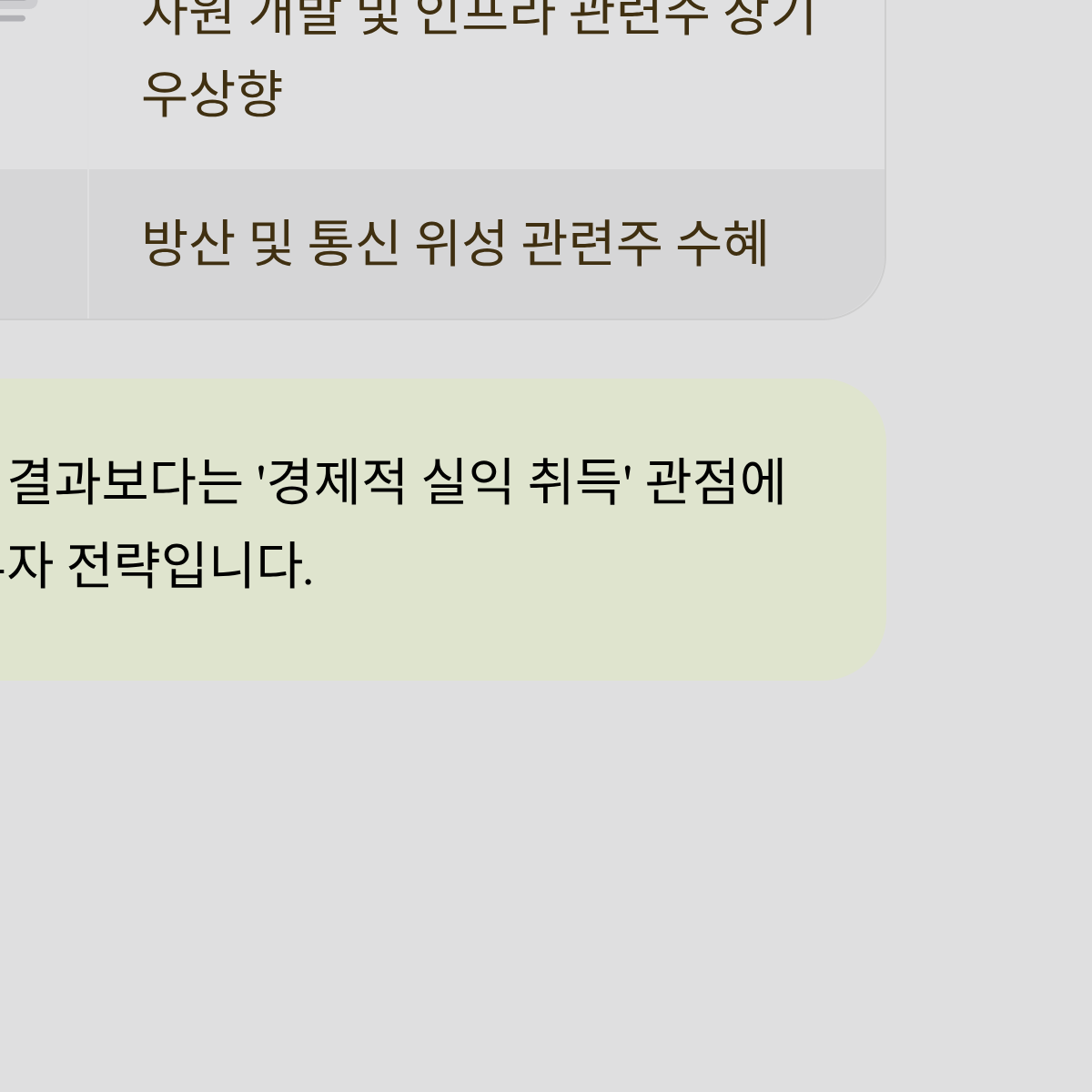 | 방위 산업 | 북극권 긴장 고조 수혜 | 낮음 (이슈 휘발성 강함) | 단기 모멘텀 플레이 권장 |