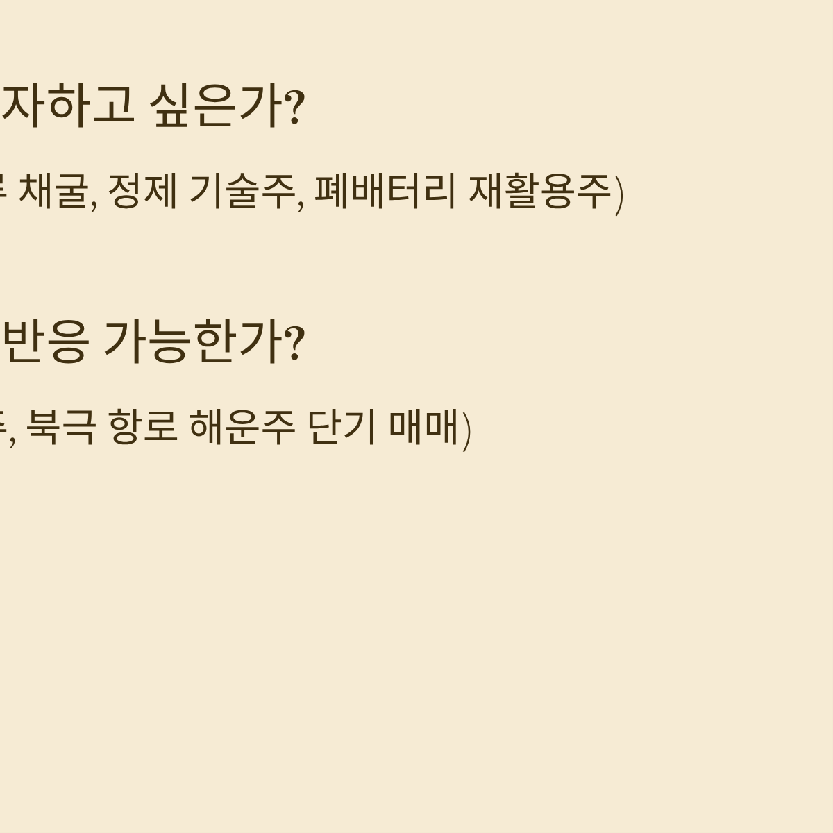 - YES → 자원 독립형 (희토류 채굴 및 정제 기술주, 폐배터리 재활용주)