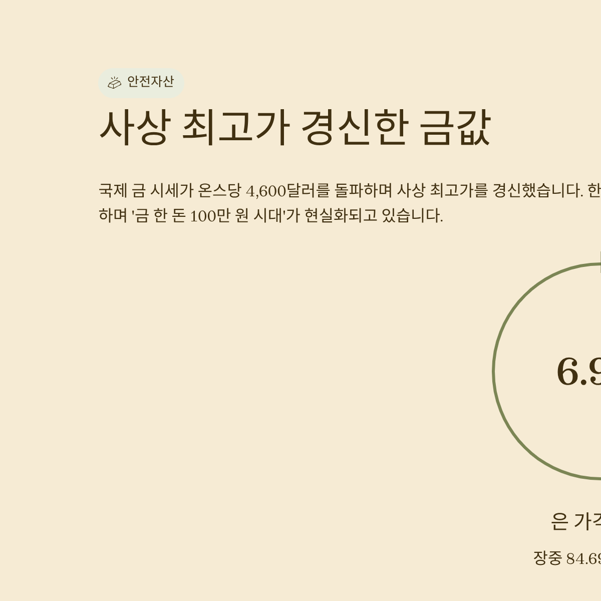 이러한 자금 쏠림은 실물 자산에 대한 신뢰도가 화폐 가치를 압도하고 있음을 시사합니다. 특히 은(Silver) 가격 역시 장중 6.92% 급등하며 84.69달러를 기록하는 등 귀금속 전반으로 매수세가 확산되고 있습니다. 투자자들은 이제 단순한 수익률보다 '자산의 안전한 보존'에 우선순위를 두고 있습니다.