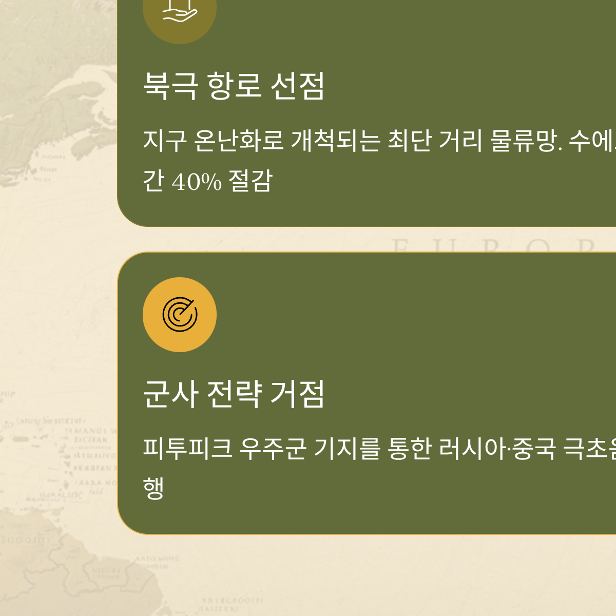 | 물류 혁명 | 북극 항로 개척 (운송 시간 40% 단축) | 해운 및 물류 인프라 관련주 수혜 |